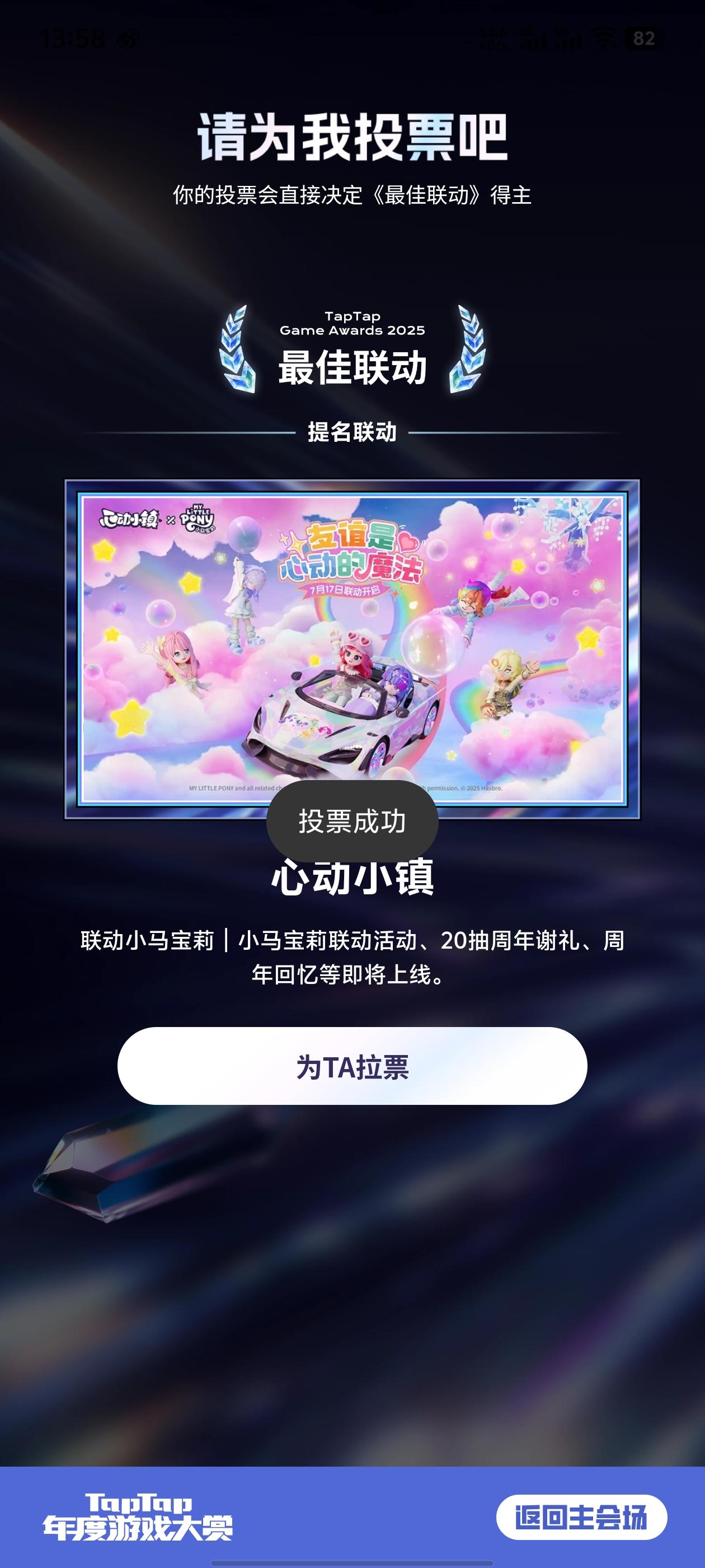 [视频]《心动小镇》现已入选 #2025TapTap年度游戏大赏 玩家奖项! 感谢所有发展家一直以来对小镇的关注和支持,为小镇投出一票,还可以参与我们准备的社区活动,赢取周边礼物哦~ 点击下方链接可直接跳转投票界面 >> * 心动小镇 | 新春季 最佳版本投票 << >> * 心动小镇 | 小马宝莉 最佳联动投票 << 投票截止:2026年1月5日