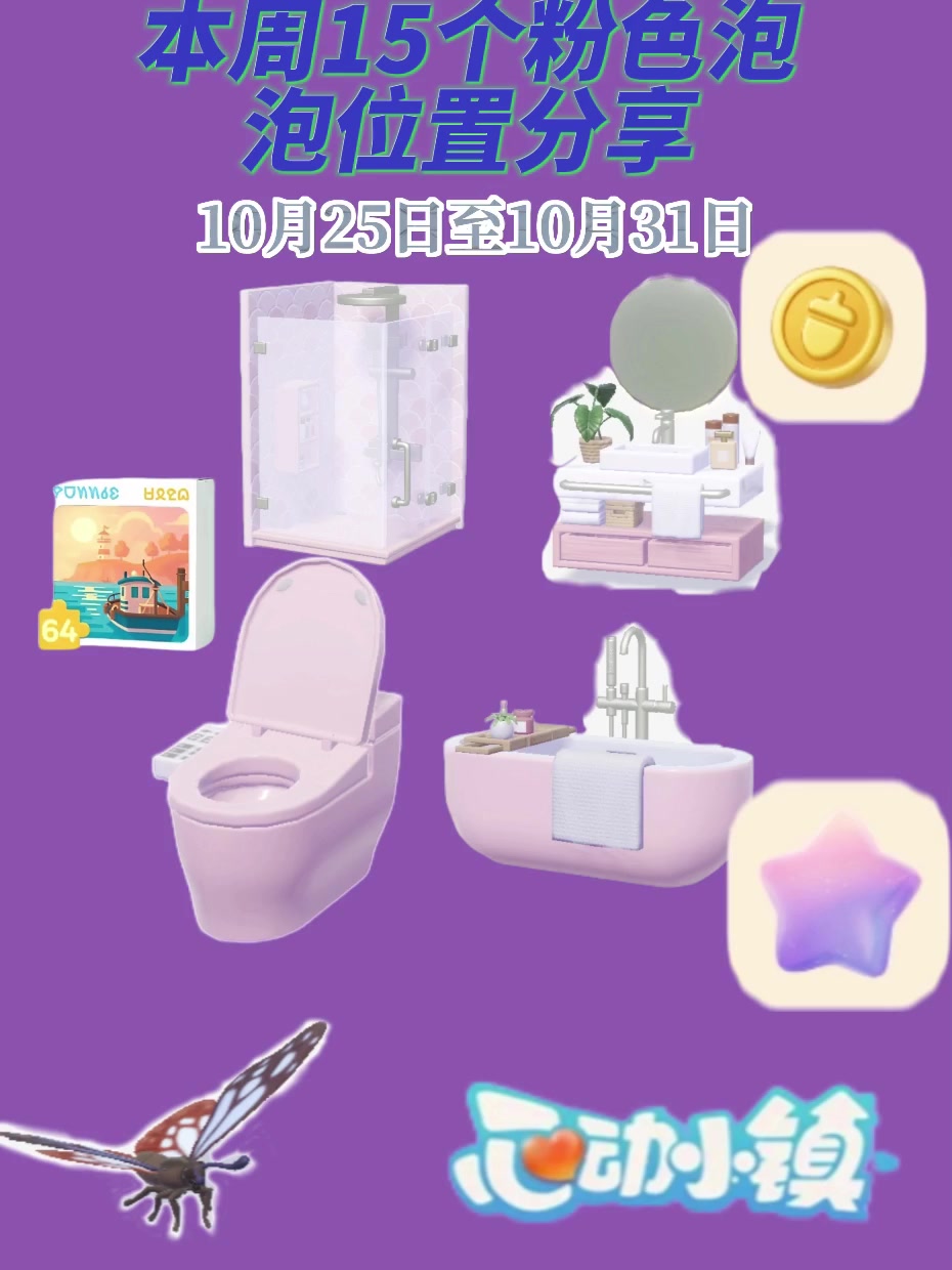 本周共15个泡泡位置已全部更新 泡泡里物品随机:如满愿星,家具,材料等 卫浴四件套(粉色浴缸,马桶,洗手台,淋浴间)#心动小镇 #心动小镇攻略 #心动小镇每周泡泡 #心动小镇泡泡