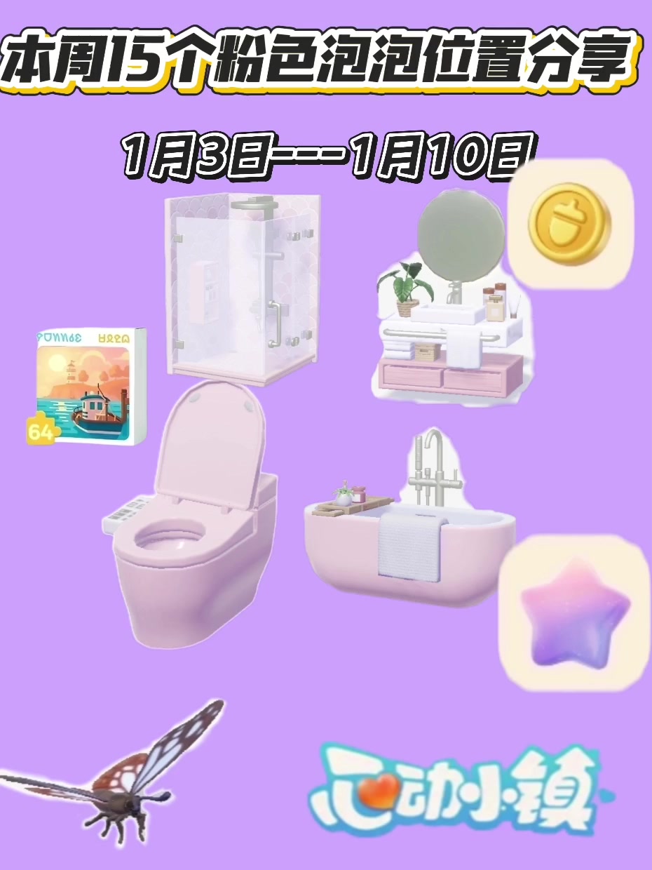 本周共15个泡泡位置已全部更新 泡泡里物品随机:如满愿星,家具,材料等 卫浴四件套(粉色浴缸,马桶,洗手台,淋浴间)#心动小镇创作计划 #心动小镇甄嬛传联动 #心动小镇每周泡泡 #心动小镇