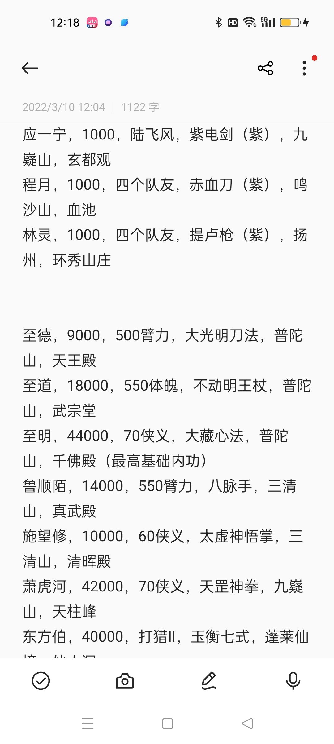 至德,9000,500臂力,大光明刀法,普陀山,天王殿 至道,18000,550体魄,不动明王杖,普陀山,武宗堂 至明,44000,70侠义,大藏心法,普陀山,千佛殿(最高基础内功) 鲁顺陌,14000,550臂力,八脉手,三清山,真武殿 施望修,10000,60侠义,太虚神悟掌,三清山,清晖殿 萧虎河,42000,70侠义,天罡神拳,九嶷山,天柱峰 东方伯,40000,打猎Ⅱ,玉衡七式,蓬莱仙境
