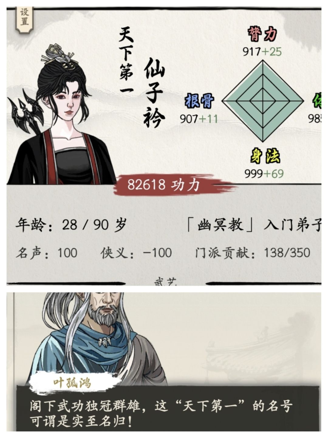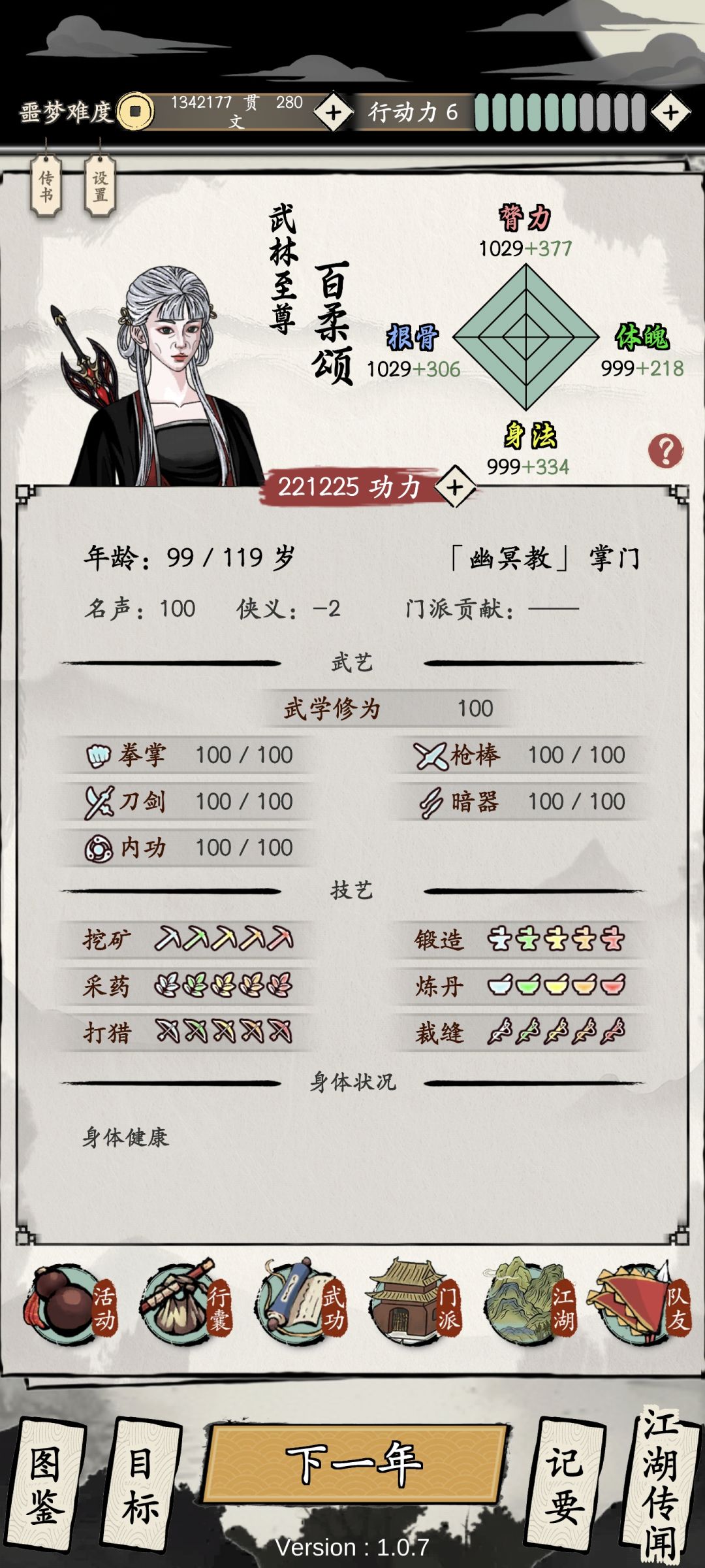 💟困难模式,8行动点 💟冲脉只点亮行动点+1 玄女/百花/幽冥皆可,SL大法 💕全程看广告 以幽冥教为例: ① 李白,贪婪,血滴 三国,灵丹,防御 悬壶,无为,大巧 ② 10-18岁:加点 ,膂力400+,根骨400+,体魄400+,身法300+ *门派任务灭寇 穿装备,学功法但不加点 主功力达到380∽400(见封面) ③ 19岁:广告(高手)过战斗➕嗑十全丸 主680∽700(见封面