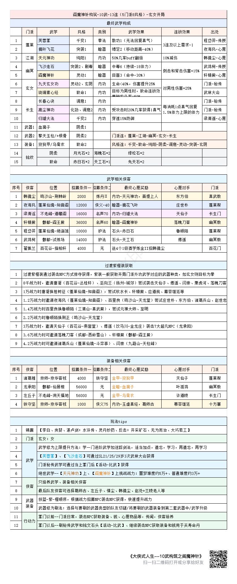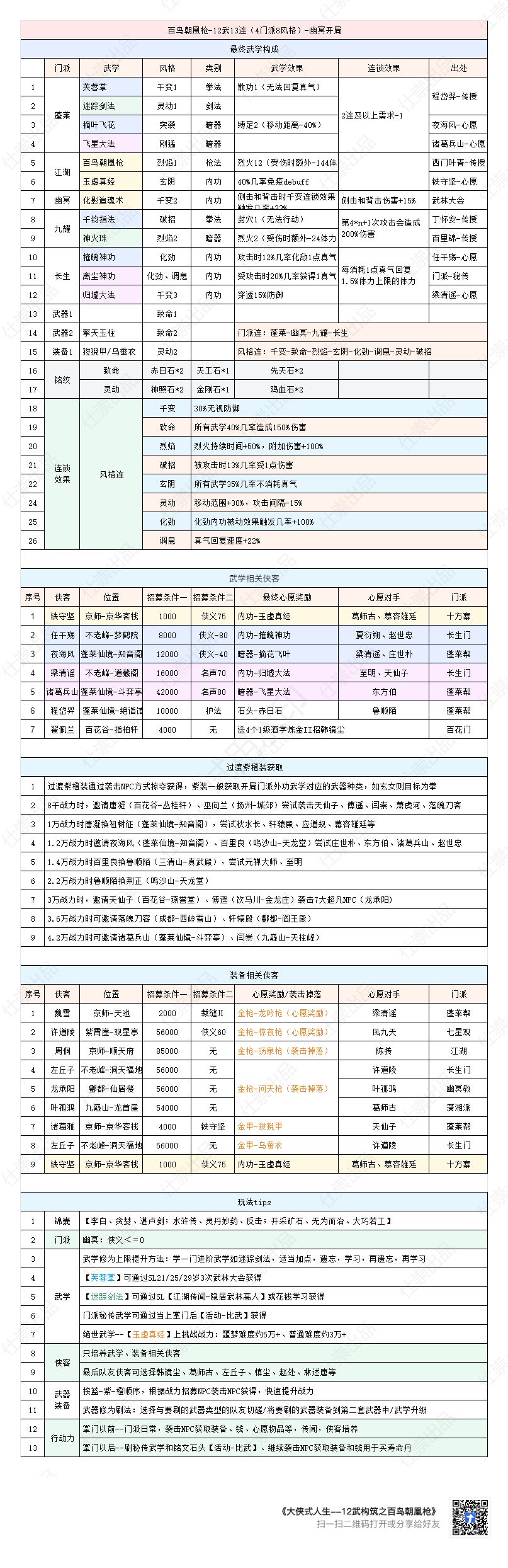 本构筑特点: 1. 2江湖武--百鸟朝凰枪、玉虚真经(40%免疫debuff) 2. 幽冥绝世内--化影追魂术,将小千变提升至大千变 3. 3长生确保稳定回血,有血才能继续战斗至胜利 4. 风格连除常规的千变、灵动、致命、化劲、调息外,还选择了玄阴(节蓝)、破招(减伤)等 ---------------------------------------------------------------