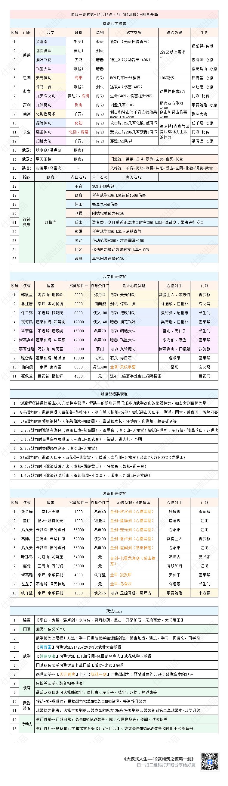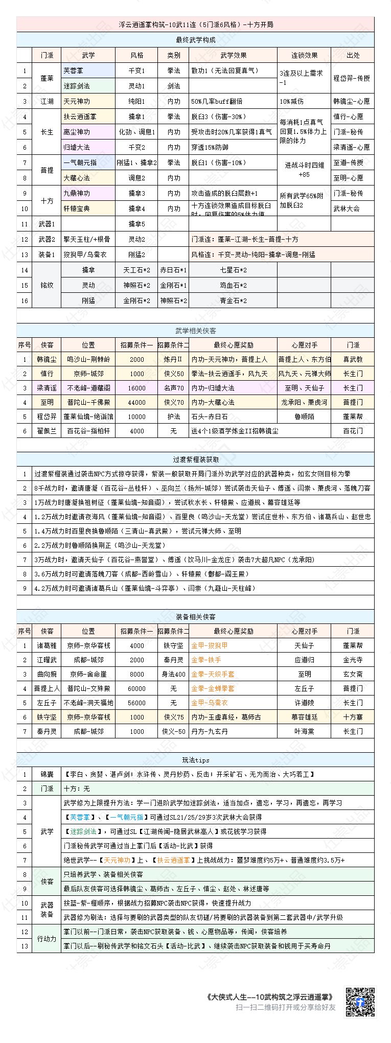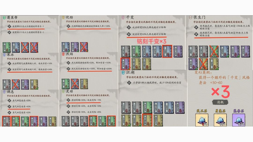 玩了将近100小时了,确实很杀时间[表情_开心]。看到不少武功构筑的帖子,都不错,但没有从小系统和组件角度讨论如何构筑自己大侠的武功的帖子,所以这里写一点自己的心得,希望还有人看。 小系统,顾名思义,就是通过2-3个非本系武功,极大提升自身连锁属性的组合。 常见的小系统有以下几个: 2蓬莱:非常好用的小系统,不仅可以对全部3或更高连锁的条件-1,本身也能够提供很多风格加成。 以我的感受,2蓬莱有两