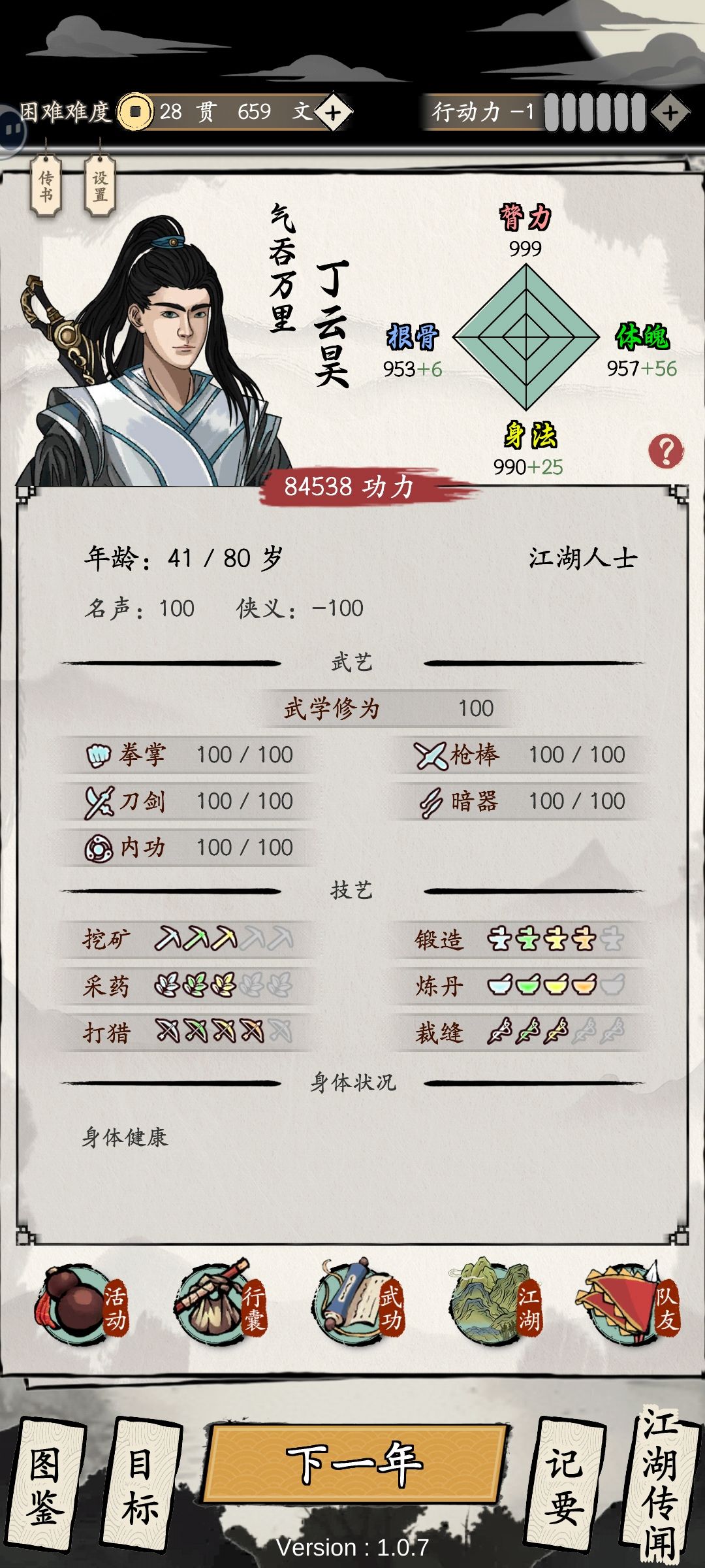 想要28岁达到天下第一也好还是快速提高战力也好,最关键就在抢劫,所谓杀人放火金腰带,在你有1万多战力的时候(一万战力宝藏大概就出紫装了,3万金装,金装记得s/l个好点的)就可以找小弟去抢有雪莲丹的角色了,蓬莱的夜海风12000就可以招了,17000的战力满满的性价比,还可以快速拿起4蓬莱。爆的雪莲丹可以让我们一直在这一年里一直行动一直提升一直有经验,如果都抢完了行动力有多余可以修行和去罗汉阵,装备