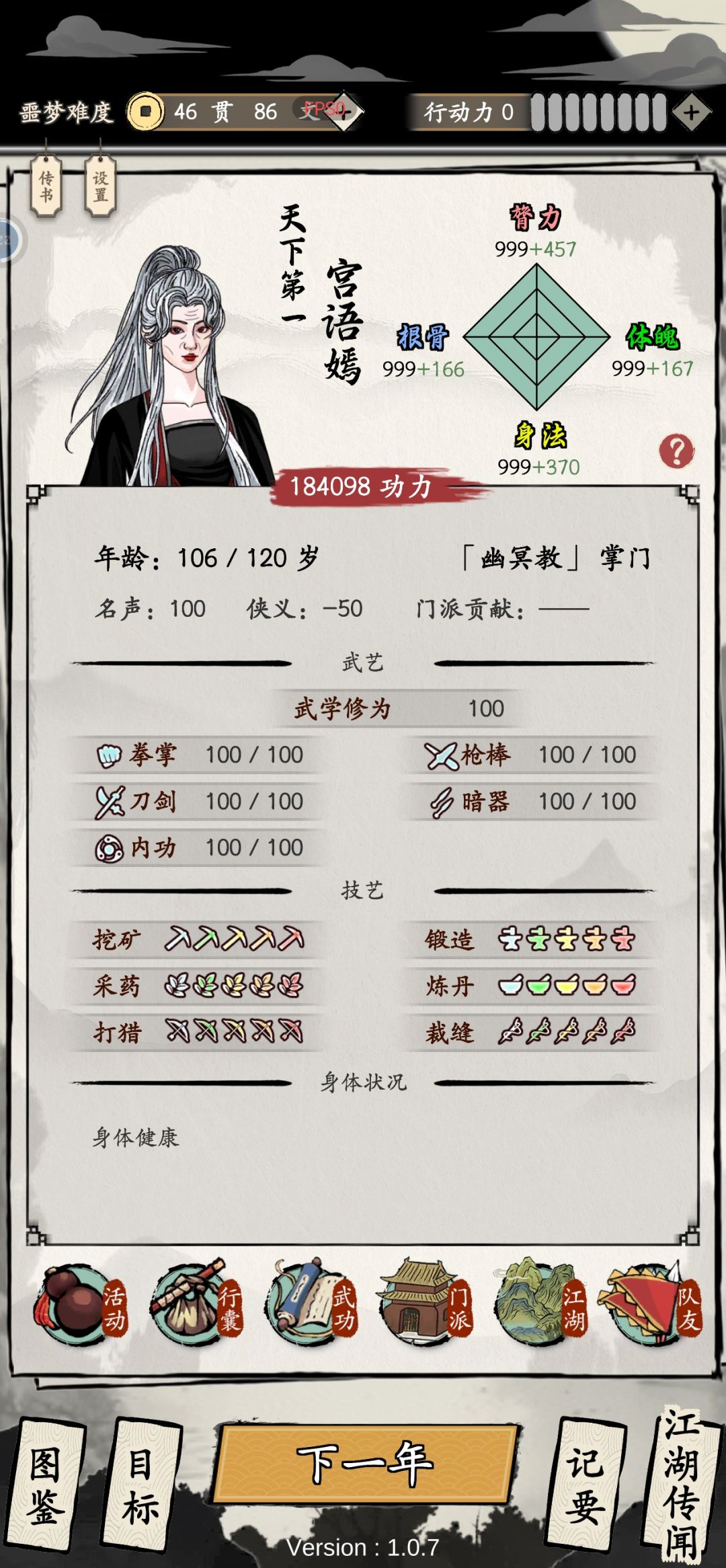 幽冥12武,8体,1500层,武功见图。 干到1500层,干不动了,分享一下心得,幽冥不用生产,专找有有体力丹丸的侠客干架(具体的侠客论坛里有大佬发),顺便搞钱,各种大会的奖品能拿尽拿。药店里健气丸,凝碧丹性价比高优先买,雪莲丹有钱再买。前期姑苏剑法过渡,中期换问天和惊鸿都行。大后期可以闭关了搞掌法,装备铭刻 2致命,1千变。友情提示:不要完暗器!不要玩暗器!不要玩暗器!分享掌法20次1469。