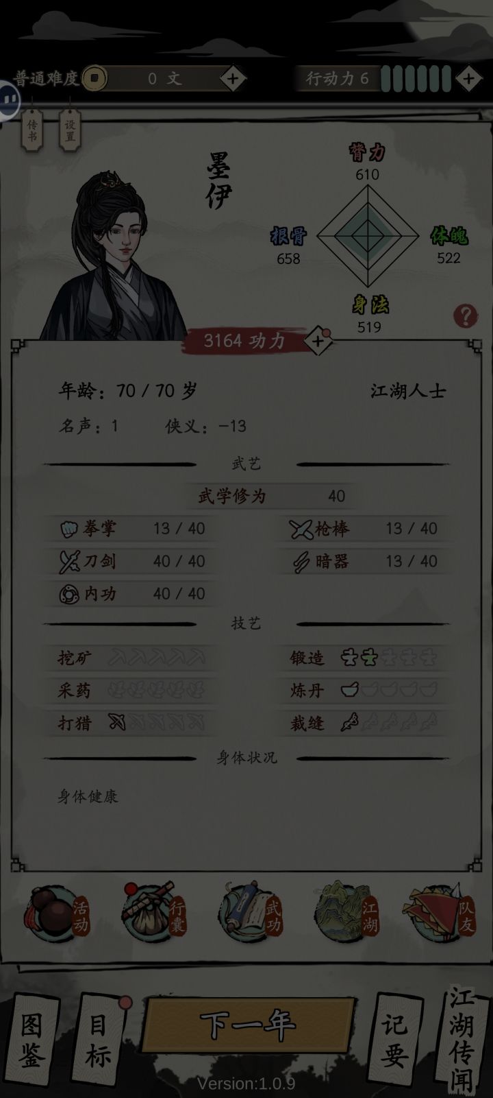 开局选十方,有两个好处,一个就是脱臼技能,一个是对正义点没要求,不会像真武,负了要关半年禁闭!三个行动指令啊!和上次选真武不同的是,十方前期任务没真武三百点攻击加成,开局一打一百多伤害,很难打,但后期猛啊,十个功法到底还是太少了,前面攻略根据“醉寒梦影”发的攻略来的,但不能照抄,人家是长生体系,可以参考,比如薛巧给的紫武是暗器,而且前期要到处学功法,不然谁谁都打不过,说一个小技巧,比如十方,用的武