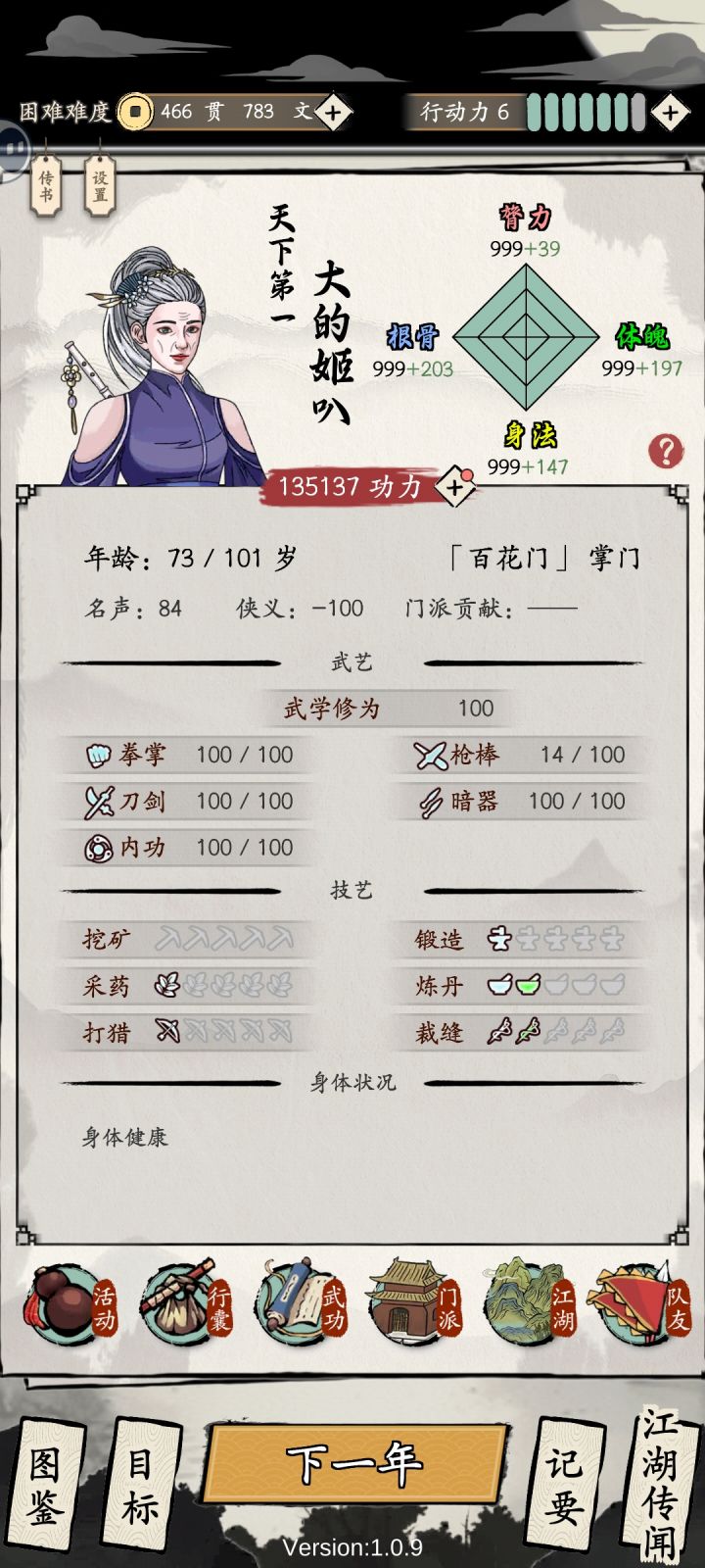 开局选十方,有两个好处,一个就是脱臼技能,一个是对正义点没要求,不会像真武,负了要关半年禁闭!三个行动指令啊!和上次选真武不同的是,十方前期任务没真武三百点攻击加成,开局一打一百多伤害,很难打,但后期猛啊,十个功法到底还是太少了,前面攻略根据“醉寒梦影”发的攻略来的,但不能照抄,人家是长生体系,可以参考,比如薛巧给的紫武是暗器,而且前期要到处学功法,不然谁谁都打不过,说一个小技巧,比如十方,用的武