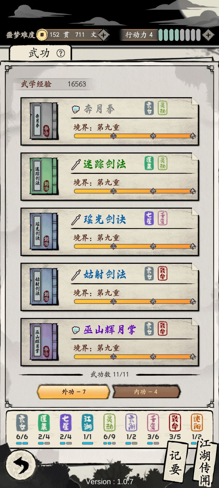 断断续续玩了两周,也是轻松打通了地狱难度。分享一些发育经验给萌新前言、基础篇①游戏就是纯单机,而且是本地存档,换设备登同样账号不继承存档②神技——Home大法,在事件出结果的时候不满意可以直接退出重进以达到改结果的目的,注意部分事件会导致状态变动进而锁定结果(如受伤状态)。一、总纲篇①提升幅度上,武功等级<装备<内功等级,所以中期爆发需要多升级内功②门派任务需要一直做,升职位才能解锁后