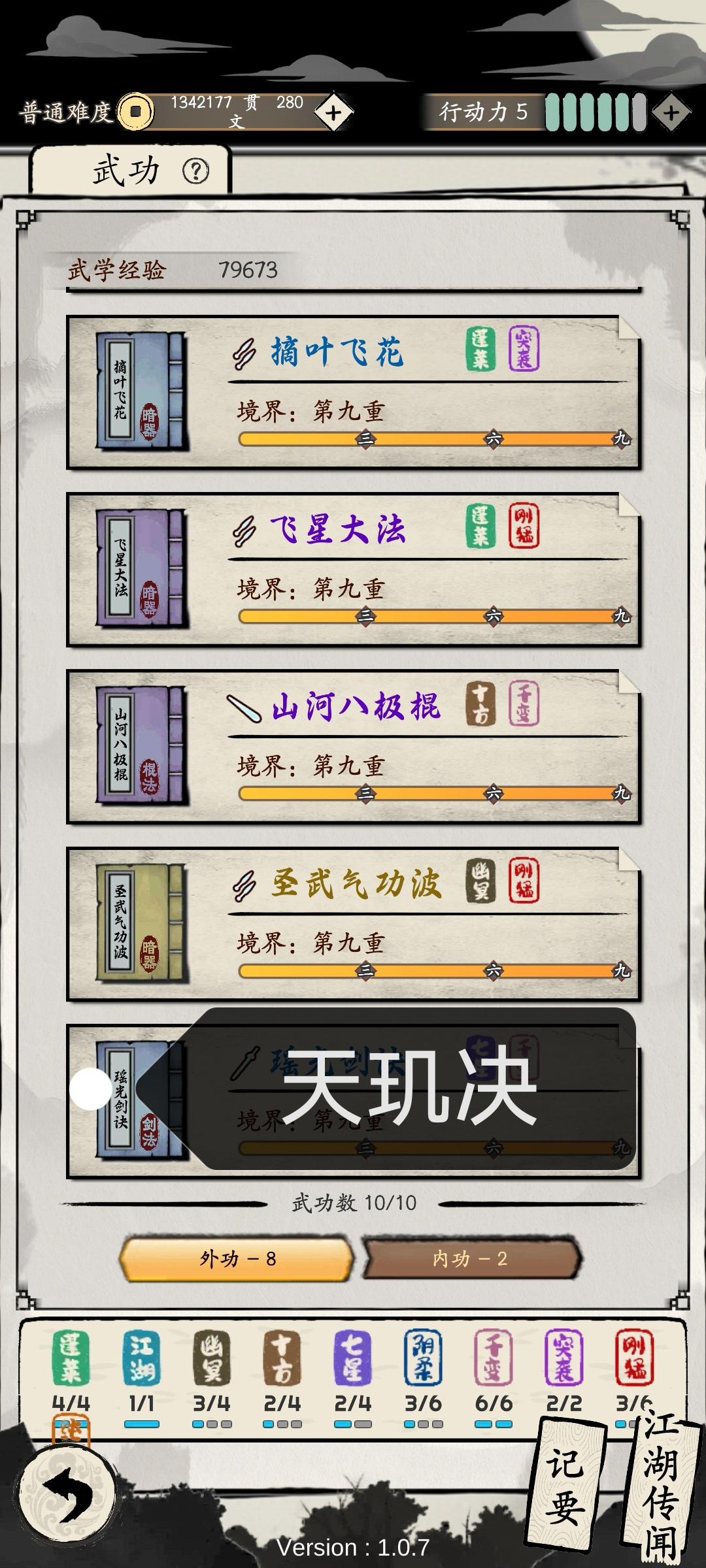 开局选十方,有两个好处,一个就是脱臼技能,一个是对正义点没要求,不会像真武,负了要关半年禁闭!三个行动指令啊!和上次选真武不同的是,十方前期任务没真武三百点攻击加成,开局一打一百多伤害,很难打,但后期猛啊,十个功法到底还是太少了,前面攻略根据“醉寒梦影”发的攻略来的,但不能照抄,人家是长生体系,可以参考,比如薛巧给的紫武是暗器,而且前期要到处学功法,不然谁谁都打不过,说一个小技巧,比如十方,用的武
