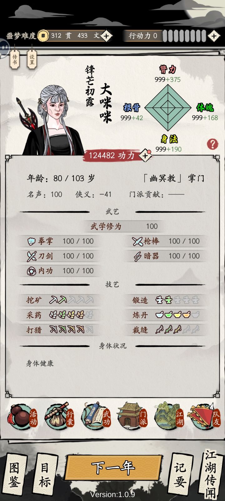 前言:在四维160,10体,12武,下结合另一个大佬28岁速通思路的关于真武噩梦难度下平滑过度到掌门思路的延伸。需要看一定量的广告。部分江湖任务因为游戏特性必须手操。因为真武是绝对正义门派,所以需要控侠义值,不然负侠义每年结束广告看的飞起。因此也不建议玩儿真武刷分,效率不如幽冥、长生、玄女、百花。正文:第一年全加根骨,选李白,懒惰,湛卢剑。第二年根骨+400后全加体魄,选三国,灵丹妙