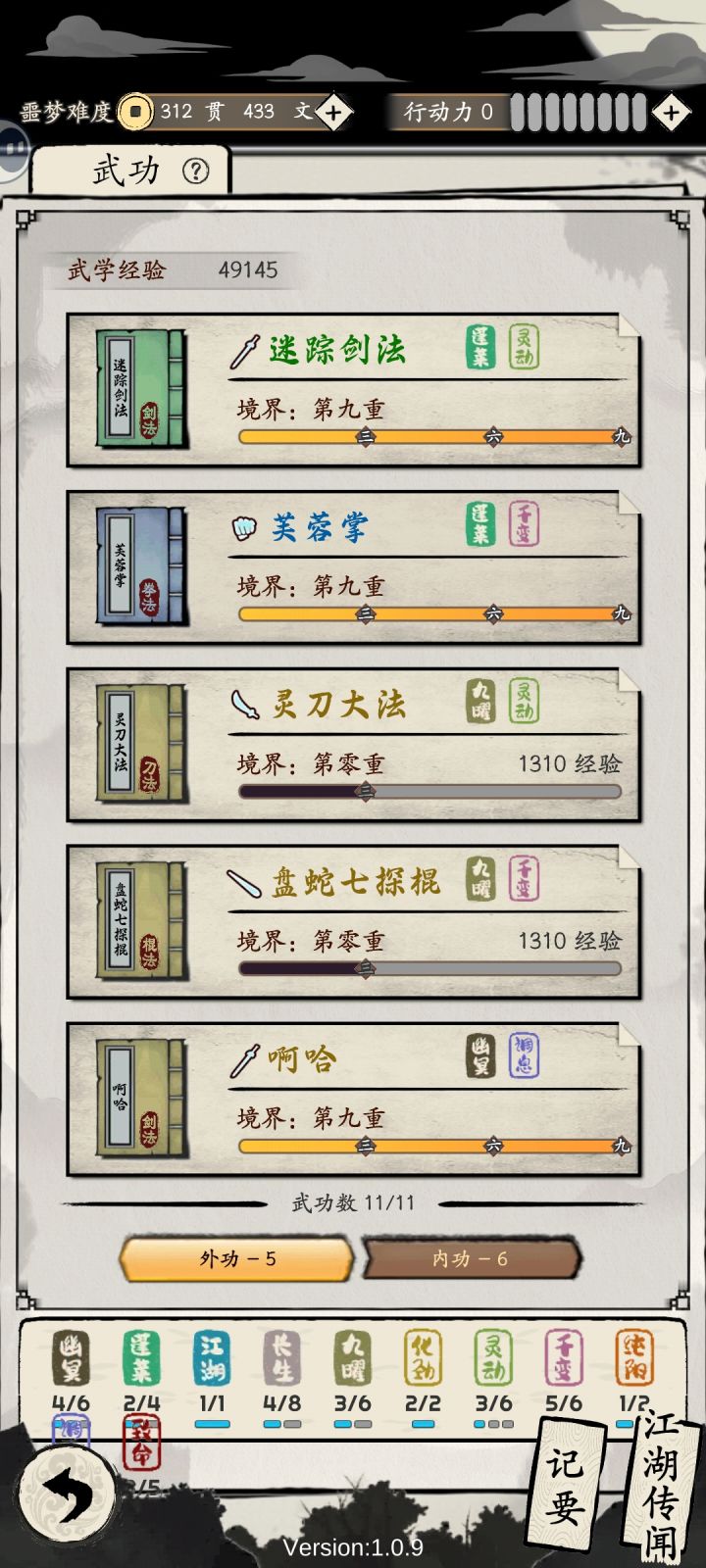 开局选十方,有两个好处,一个就是脱臼技能,一个是对正义点没要求,不会像真武,负了要关半年禁闭!三个行动指令啊!和上次选真武不同的是,十方前期任务没真武三百点攻击加成,开局一打一百多伤害,很难打,但后期猛啊,十个功法到底还是太少了,前面攻略根据“醉寒梦影”发的攻略来的,但不能照抄,人家是长生体系,可以参考,比如薛巧给的紫武是暗器,而且前期要到处学功法,不然谁谁都打不过,说一个小技巧,比如十方,用的武