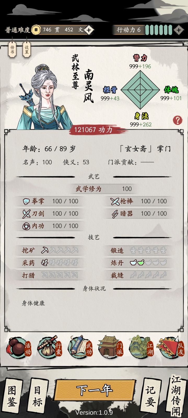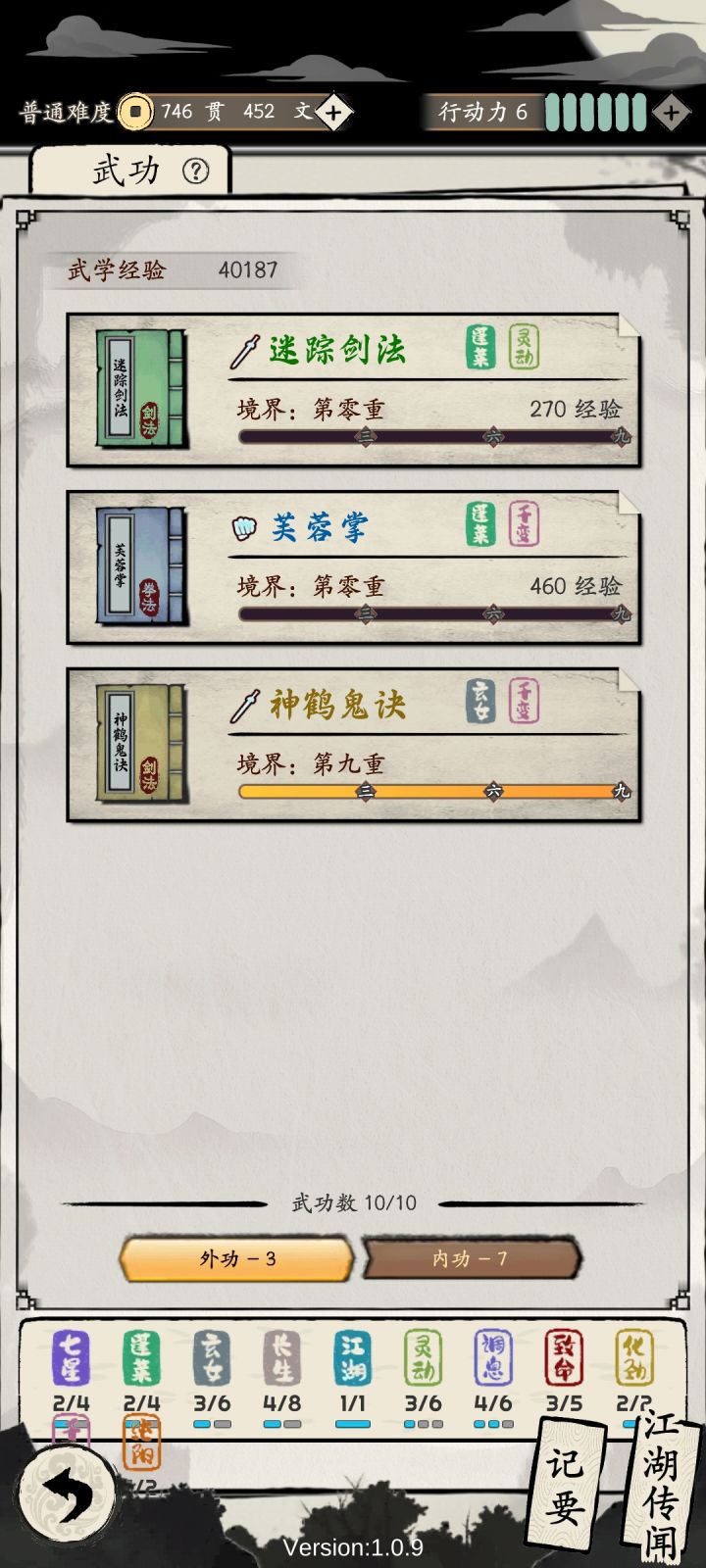 开局选十方,有两个好处,一个就是脱臼技能,一个是对正义点没要求,不会像真武,负了要关半年禁闭!三个行动指令啊!和上次选真武不同的是,十方前期任务没真武三百点攻击加成,开局一打一百多伤害,很难打,但后期猛啊,十个功法到底还是太少了,前面攻略根据“醉寒梦影”发的攻略来的,但不能照抄,人家是长生体系,可以参考,比如薛巧给的紫武是暗器,而且前期要到处学功法,不然谁谁都打不过,说一个小技巧,比如十方,用的武