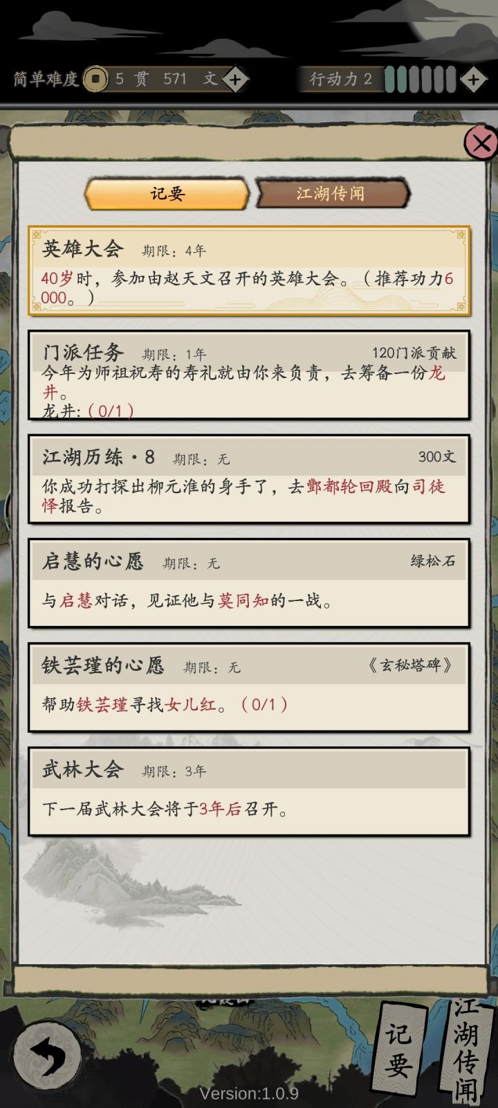💟困难模式,8行动点💟冲脉只点亮行动点+1玄女/百花/幽冥皆可,SL大法💕全程看广告以幽冥教为例:① 李白,贪婪,血滴 三国,灵丹,防御悬壶,无为,大巧 ② 10-18岁:加点 ,膂力400+,根骨400+,体魄400+,身法300+*门派任务灭寇穿装备,学功法但不加点主功力达到380∽400(见封面)③ 19岁:广告(高手)过战斗➕嗑十全丸主680∽700(见封面