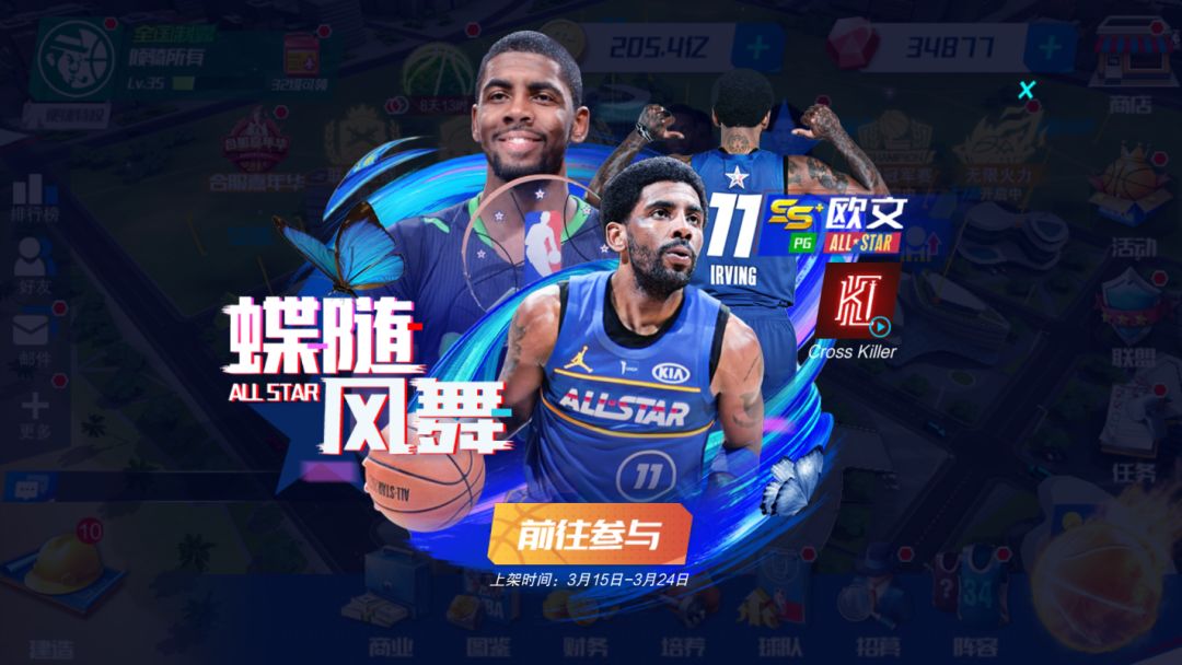 2011年NBA选秀中以状元身份被骑士队选中 职业生涯获得1次总冠军 8次入选全明星阵容 2014年17投14中,获得全明星赛MVP! 现效力于NBA达拉斯独行侠 如今的NBA球员工会副主席 顶尖的技术、速度和意识,一度叱咤球场! 全明星限定系列球员爆料 春暖花开,蝶随风舞 3月18日,限定凯里·欧文即将登场! SS+限定大师 【招牌技能】势如疾风-限定 下X个回合,自身2分+X%;自身每回合2分