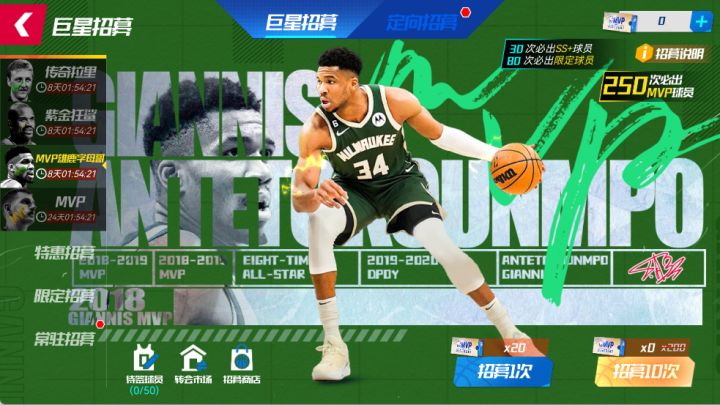 琳琅满目,MVP接踵而至;一览无余,全明星尽情自选!MVP字母哥招募卡池活动时间:7月4日 18:00-7月11日18:00活动期间,可使用【MVP特惠招募券】在【MVP招募】池中,招募MVP雄鹿字母哥。MVP卡池全员首次十连免费!至多抽取250次,成功将MVP雄鹿字母哥签约入队!130抽必出SS+限定球员,每30抽必出大师球员!(本次MVP球员无外显套装,且之后无外显补领活动)