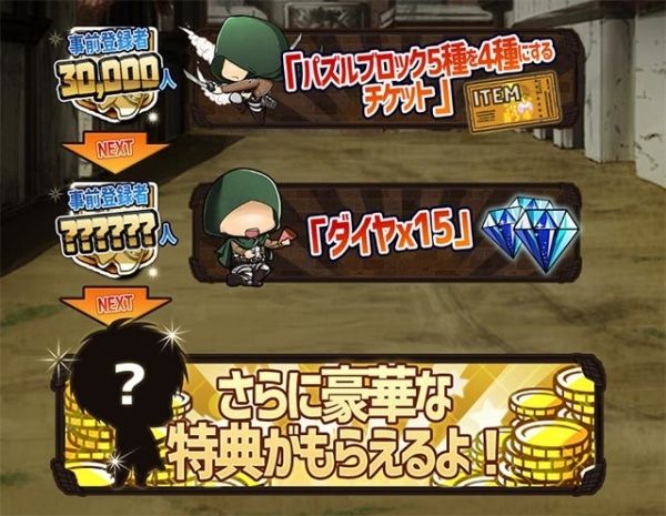 日本 Copro 公司预定于 2017 年在 iOS/Android 等手机平台上推出,以人气动漫《进击的巨人》为主题改编而成的手机益智新作《进击的巨人 连锁益智狂热》(Attack on Titan Chain Puzzle Fever/进撃の巨人 チェインパズ儿フィーバー,中文名暂称),近日官方正式为本作开启预注册奖励活动。这款《进击的巨人 连锁益智狂热》,是一款以日本知名漫画家「谏山创」人