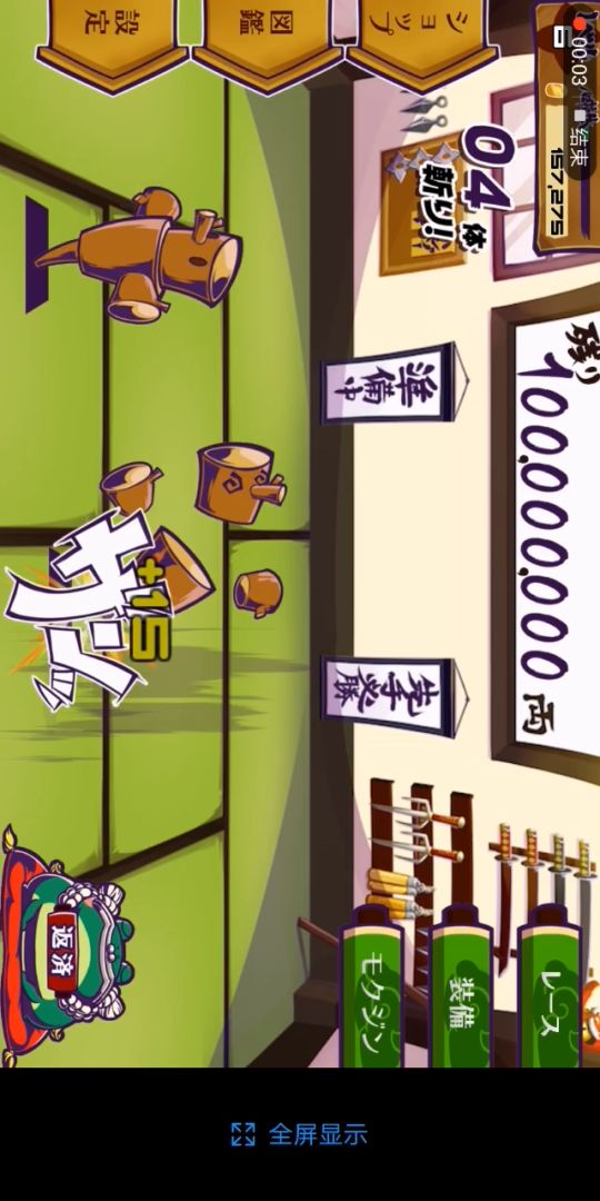 通过在训练场获得一定的资金后可以“外出做任务赚钱”了。虽然是忍者,但是做任务的方式却相当佛系,没有买卖和杀害,而是进行一场惊心动魄忍者赛跑(可能还有其他形式的任务吧)。选择好赌金和赔率,进入后快速点击下面的卷轴给忍者应援,路遇稻草人拔刀削之,最先到达重点就能得到赌金x赔率的资金。这个画风让我想起了《迷你忍者》,虽然一个3d一个2d≡_≡另外,这个游戏强制全屏显示(大于16:9)两边会有白边。嘛,多年前的游戏不要要求太多了,那时还都是16:9吧。
