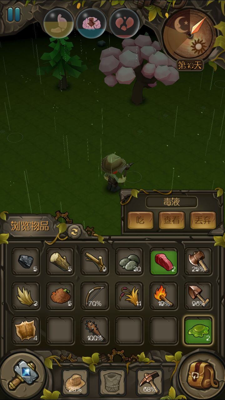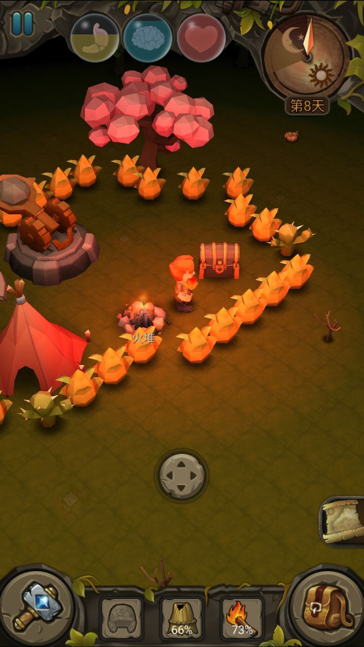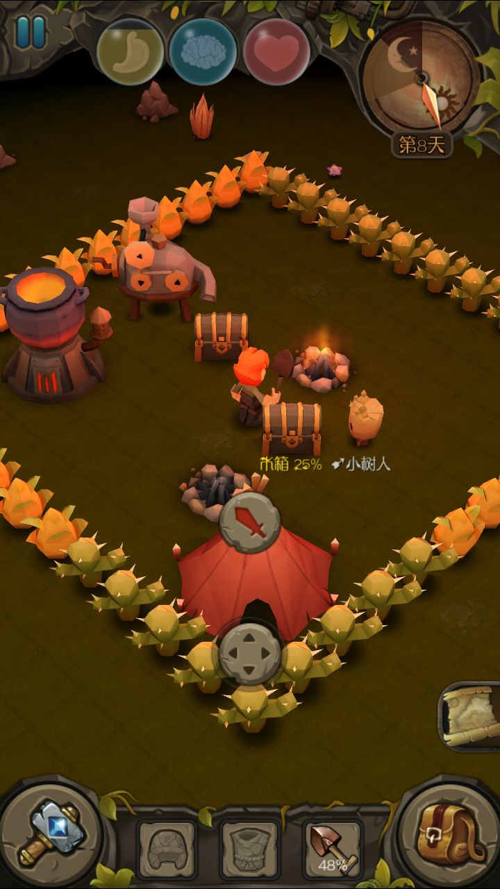首先玩这游戏你必须要懂以下的要点1.前五天,第一天采集木头,树枝,草,小石头,出科技,石器科技,工具四种通通做个,第一次必须靠近科技做。然后跑图,找到第一层有猫的沙漠,拿两张猫的皮。这个可以拉蝎子打猫,或者出个武器自己打。两步一跑。必须在第五天前做出帐篷,解决智障问题。2.白天随意,晚上必须浪。(守家是前几天可以玩玩,后面出boss带一群小怪难度太大,防御塔输出有点坑,消耗太大,最好是在野外借