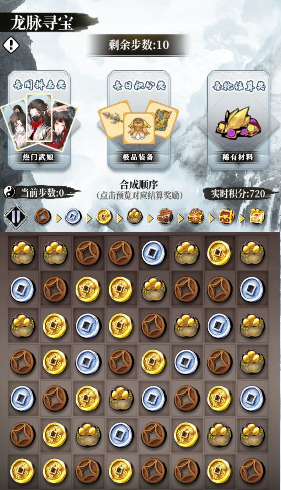 “龙脉寻宝”从零到精通 自古以来,乱世黄金,盛世古董,天华物宝龙脉尽收之。 江湖乱起云波诡,掌门一身祥瑞龙气,又得众多声叱江湖的武娘相随,眼前龙脉,掌门与众位武娘齐心协力,龙脉中的宝物定是信手拈来! “龙脉寻宝”是这次《武娘外传》测试新增加的休闲性玩法,主要是满足三消狂热者的追求。 玩法说明: 1、 只需要一张寻宝卷,掌门便可以开启与武娘们的龙脉探险之旅了。(寻宝卷可通过觉醒获取) 2、 步数: 1