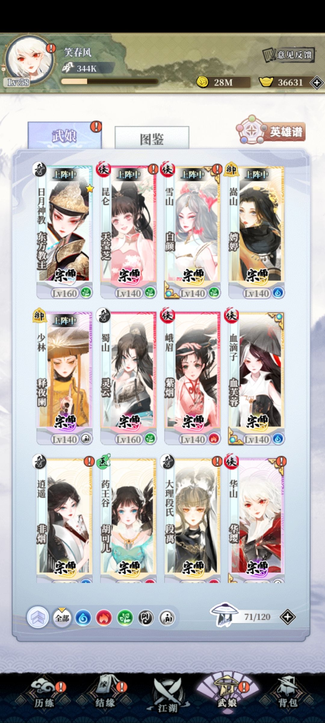 平民来看看,土豪慎入,速速离去 1.火(送的多,新手容易凑齐): ①丐帮(偷防御,几回合后很肉而且可以方便定点切人) ②药王谷(火奶唯一,不解释) ③阴阳(偷后排,新手神卡) ④大理(后面换阴/阳奇门吧) ⑤峨眉(收割用,打boss专门练个醉拳感觉浪费) ⑥青城(控制) 火队的侠客表现真的是未来可期 (高情商:未来可期,低情商:现在就是垃圾),后面有条件峨眉换个华山吧 奇门凑合 优点:成型快,偷后