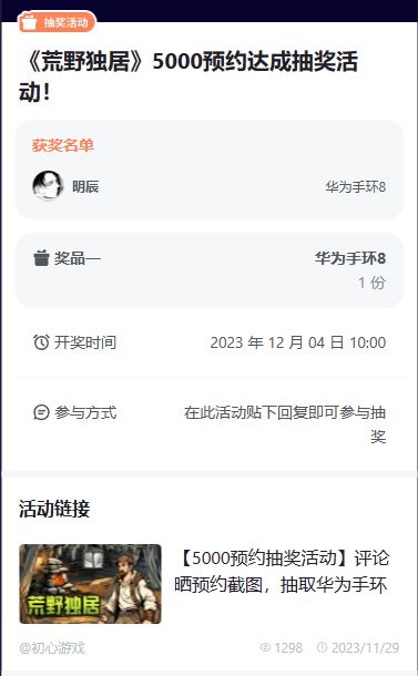 《荒野独居》自游戏开启预约以来,我们定下了两个小目标,分别是预约量达到5000和10000人。在大家的热情支持下,第一个小目标达成,游戏预约人数已经超过5000!在此小编要感谢大家对游戏的喜爱和认可,当然最重要的是我们要开始兑现承诺,开启第一波抽奖活动了!【🎁抽奖内容】✨华为手环8一个(以最终实物内容为准)【🎁参与方式】已经点击预约游戏的玩家在本贴内回复预约截图即可参与抽奖(ps:不可盗用其他