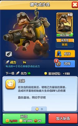 【英雄档案】喷气式步兵 —— 同归于尽亲爱的召唤师们大家好呀!又到了我们的英雄档案时间了,这次给大家带来的英雄是3段白银段位解锁的喷气式步兵,让我们看看他会给我们带来怎样的表现吧。 【英雄介绍】黄色阵容的喷气式步兵,这是一位勇敢的步兵,他配备最新型的飞行背包,虽然不确定该背包是否安全可靠,但可以肯定的是威力巨大。他手持榴弹炮,在空中给予对方沉重的打击。稀有品质的喷气式步兵,初始等级为1级