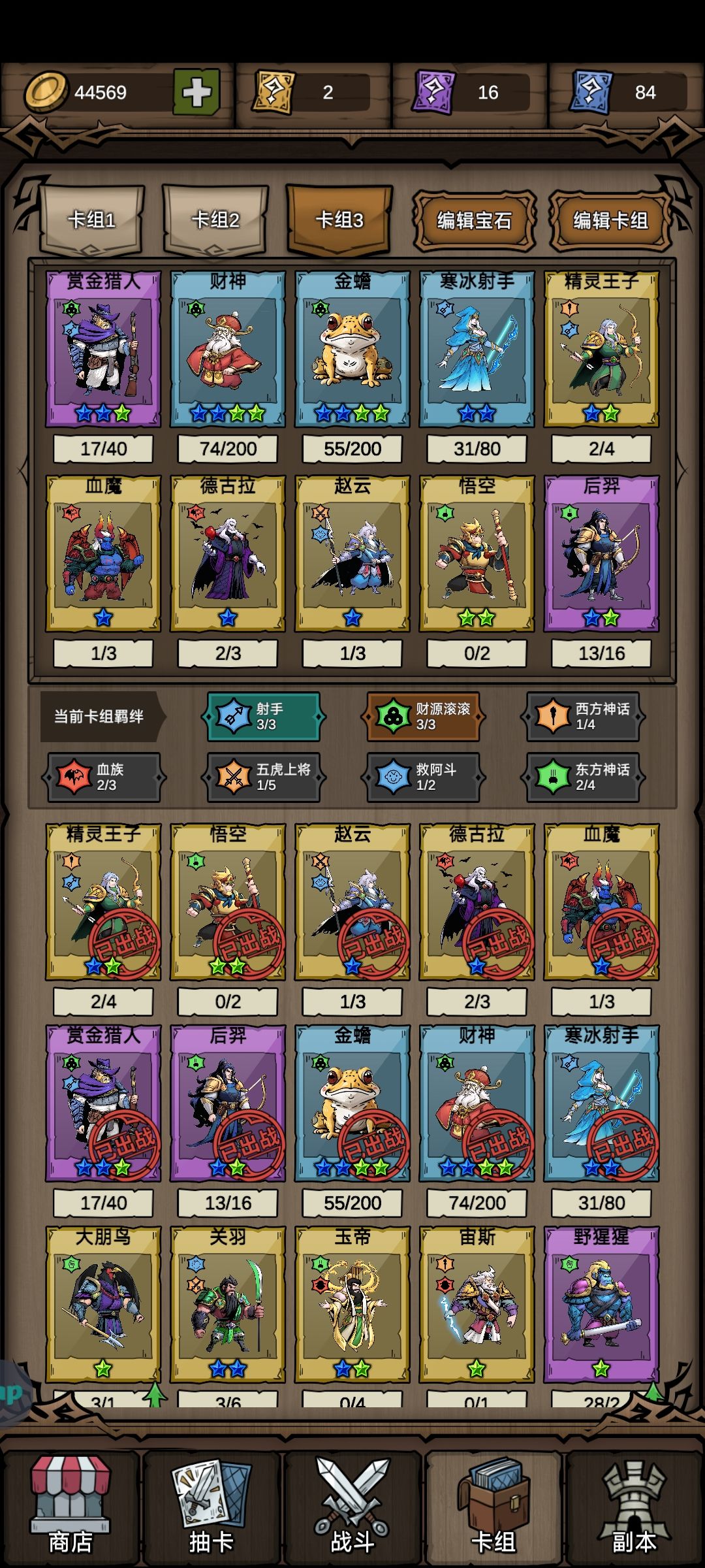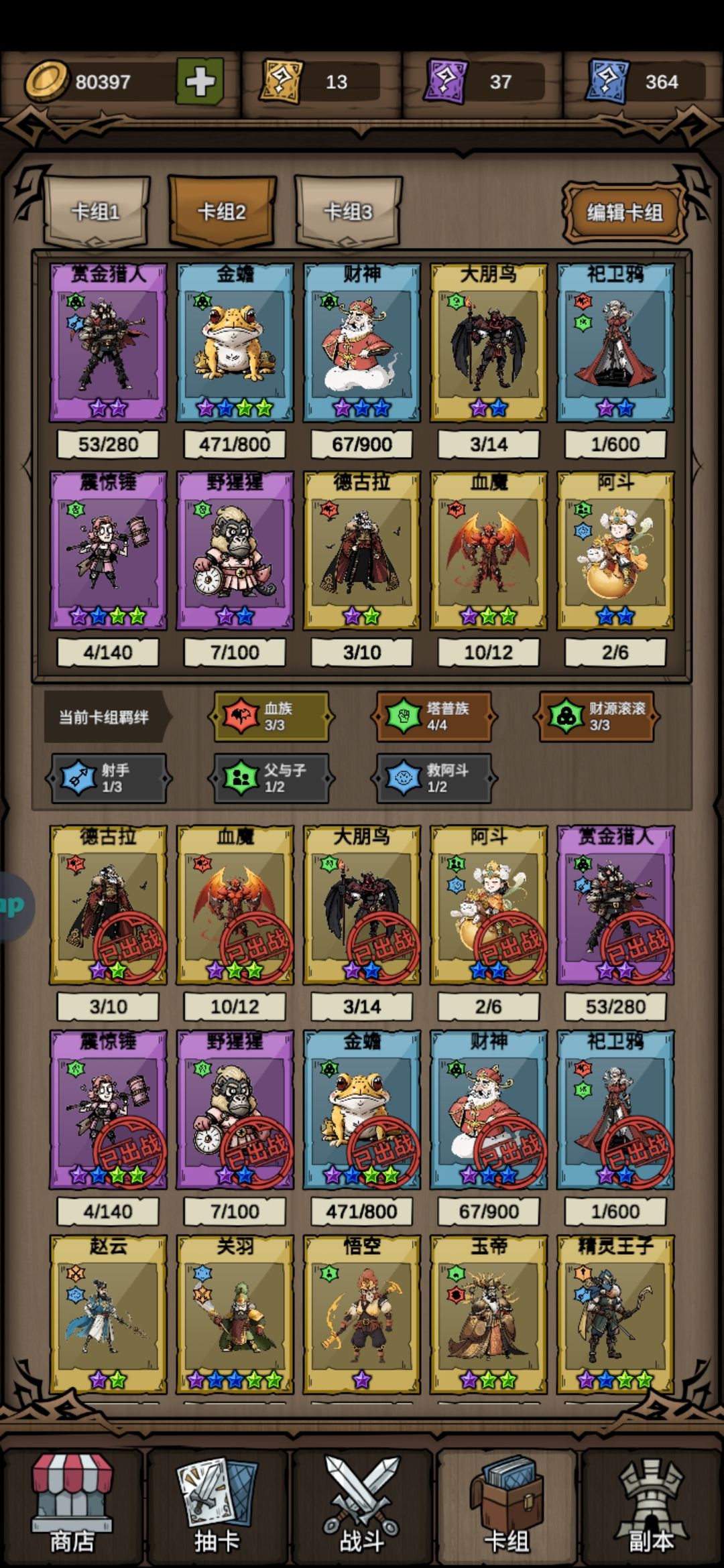 8.0评分的塔防割草《勇者干仗》玩起来是真滴爽! 虽然角色和市面上一样需要在卡池抽取,但是每通关一次新关卡都送十抽卷,抽卡也能抽到爽。 人物角色也都耳熟能详,玉皇大帝、宙斯,这次中西方神话人物大杂烩,齐上阵。每个角色也都有自己的羁绊,考虑并搭配合适的羁绊组合,消灭成堆的怪物,守卫基地。 卡组可以填充十名角色,经过我玩了几个小时的经验,我推荐的必须是财源滚滚羁绊+射手羁绊。 财神、金蟾可以提高银币获