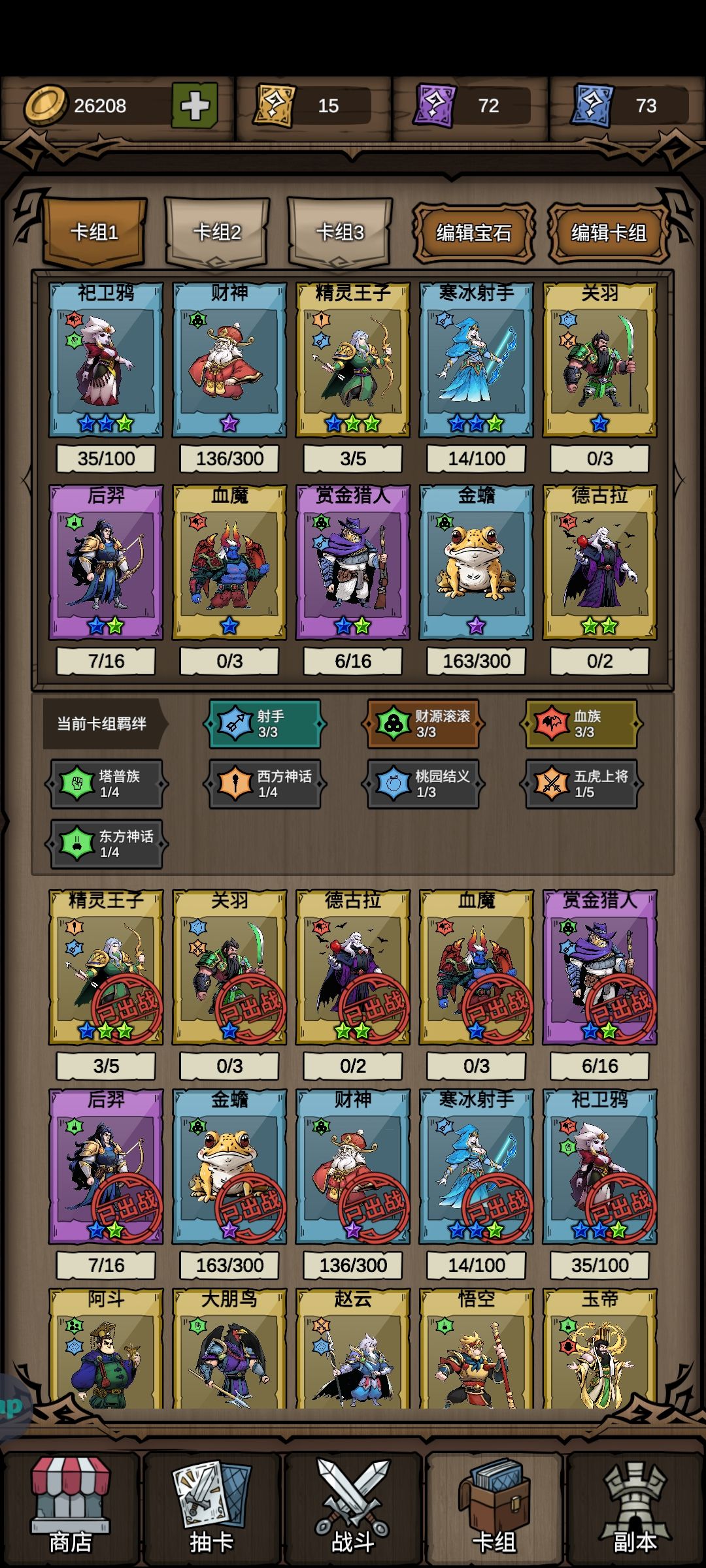 跟大佬们肯定不能比,毕竟自己刚过26关就被卡27了 现在说说过26关思路把,得益于最近大鹏鸟重做了之后超猛的属性增长,开局财源攒钱开格子,到15关后就可以卖掉金蟾先把塔普羁绊凑齐,然后就是刷出一张血族就卖一个财源剩下的2个牌,直到最后变成塔普+血族就OK了,然后坐等过关,我这里没有去刷血魔的伤害(卖卡),如果卡片强度不够可以卖卡耍耍血魔伤害 基本就是这个样子了有没有大佬说说后面应该用啥阵容的[表情_微笑]