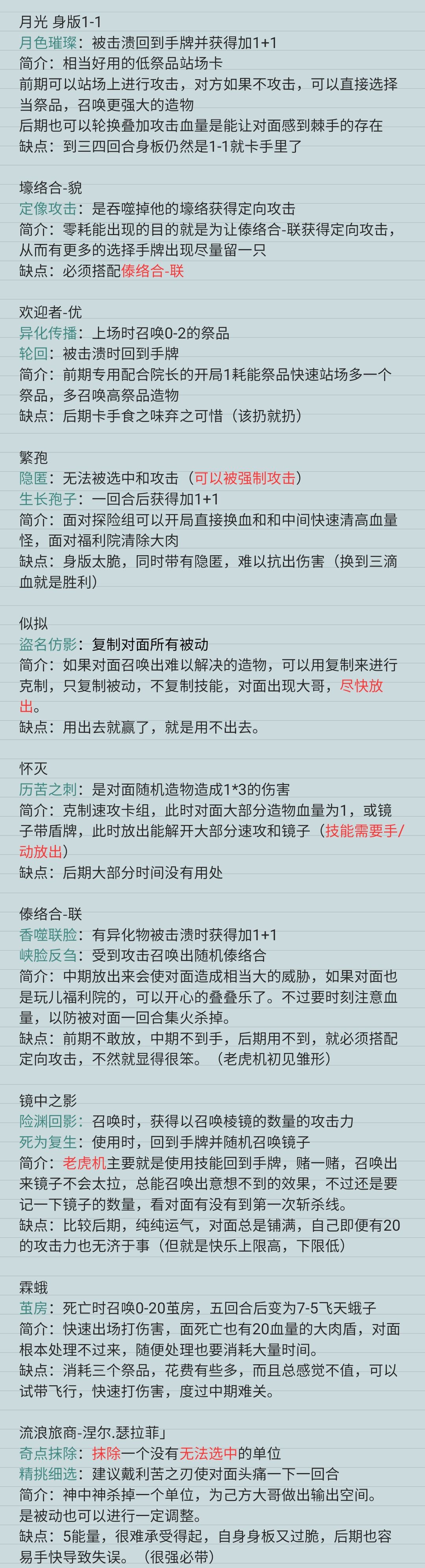 月光 身版1-1 月色璀璨:被击溃回到手牌并获得加1+1 简介:相当好用的低祭品站场卡 前期可以站场上进行攻击,对方如果不攻击,可以直接选择当祭品,召唤更强大的造物 后期也可以轮换叠加攻击血量是能让对面感到棘手的存在 缺点:到三四回合身板仍然是1-1就卡手里了 壕络合-貌 定像攻击:是吞噬掉他的壕络获得定向攻击 简介:零耗能出现的目的就是为让傣络合-联获得定向攻击,从而有更多的选择手牌出现尽量留一