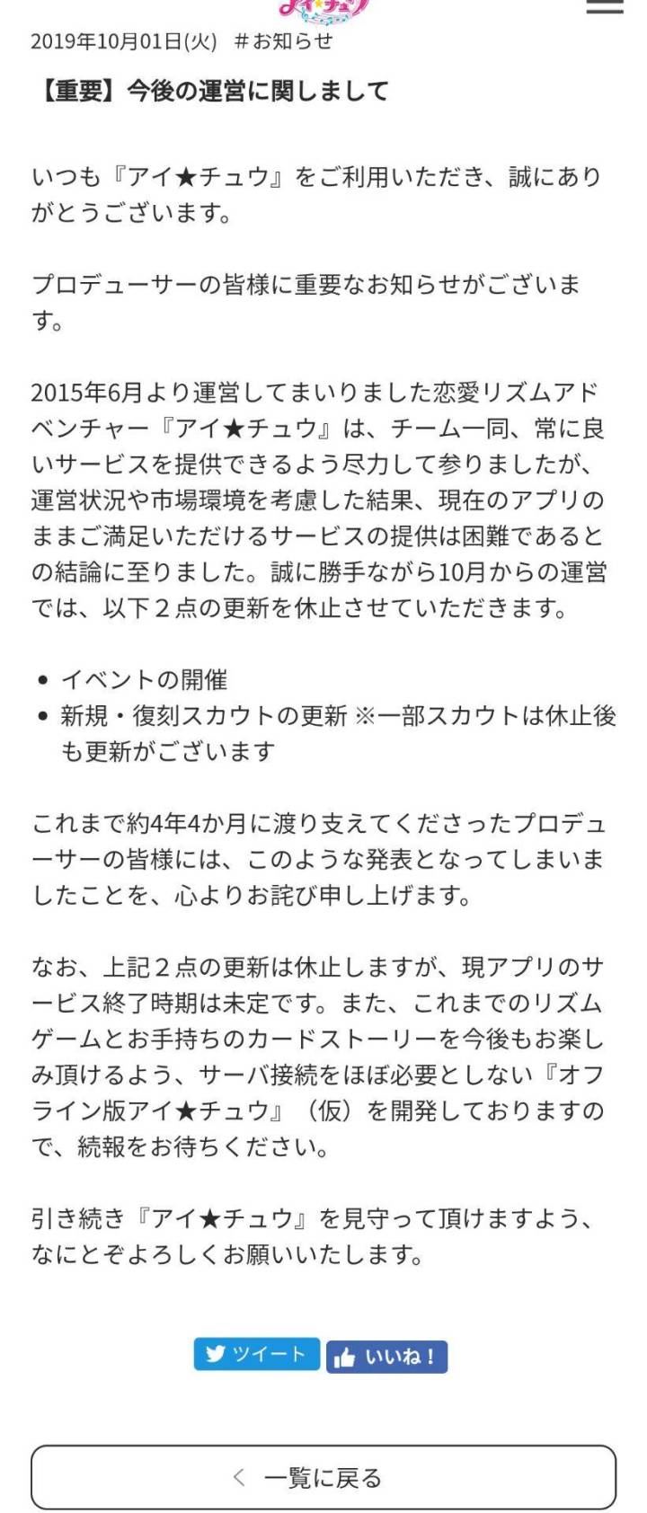 2019年10月1日通知(重要)关于今后的运营非常感谢您一直使用《I★CHU》有一件重要的事情告诉你们。从2015年6月开始运营的恋爱节奏游戏《I★CHU》,考虑到运营状况和市场环境的结果,得出了根据现在APP提供的满意服务很困难的结论。在10月开始的运营中,将会停止以下2点更新:1.举办活动2.新规和复刻卡池停止更新(一部分卡池依旧更新)对于至今为止4年又4个月来一直支持我们的p
