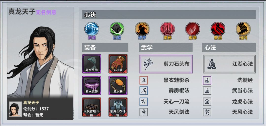 屈心《巫女》 屈原的女儿(被其老父亲指定许配给主角)由于屈原失踪,由玩家代为照顾。出生名门天生聪慧,知书达理,性格天真善良,经历主线西域将士陵事件后,迎来高光并成为陆离剑主。 自带武学《屈氏剑法》 三格直线剑法,特点为诸般封印、折光逆剑、基于敌方攻击力的暴伤,整体而言是一个不错的输出剑法,但由于屈心本身并非纯粹输出类侠客,使其可以被替代(上图为满参演满突破面板) 屈心天赋偏多且强力 不想理你(无法