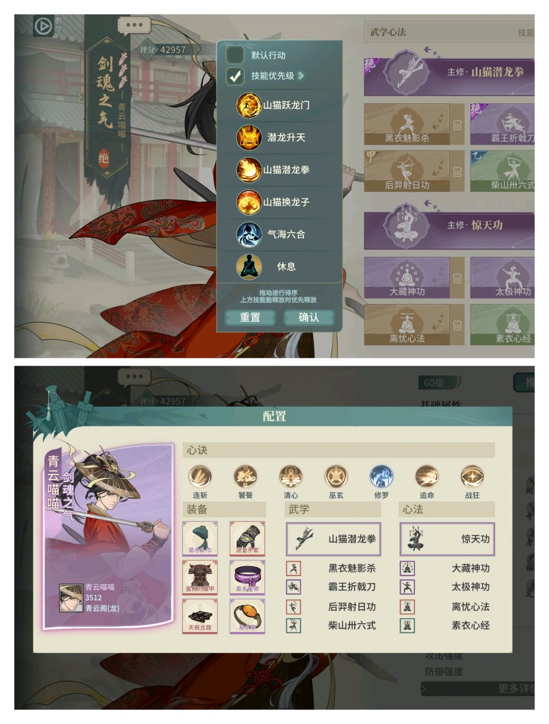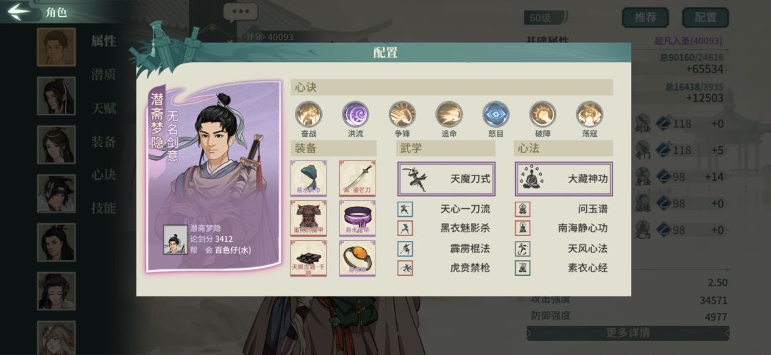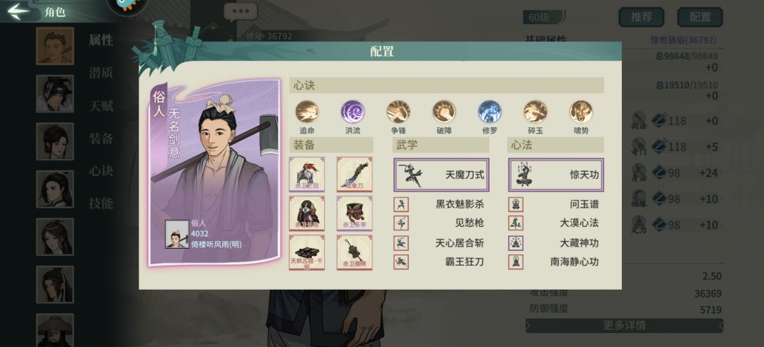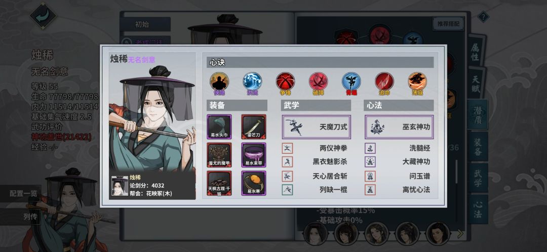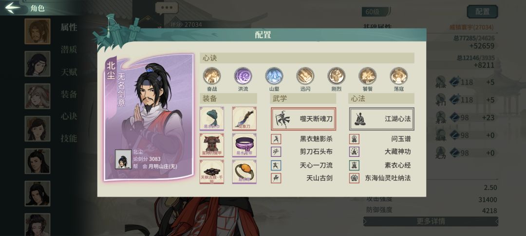 第一次上4000,发个配置,总体配置不高,只能配满七个侠客,但是配满五个也是够的。考虑到可能没有银珊,大家参考参考就行了 ------分割线 ①主角 常规配置下,我做了一些小改动,带了一个两仪。剑意怒气抵抗控制从200时序加强到了100时序,为了开局以及中期发力,所以给了两仪这个小回怒。可以有效解决对面的乱花问题。(易水头有迷茫抵抗,剑意抵消控制计算易水头迷茫抵抗)。为什么不给天风心法不给龙爪手嘛