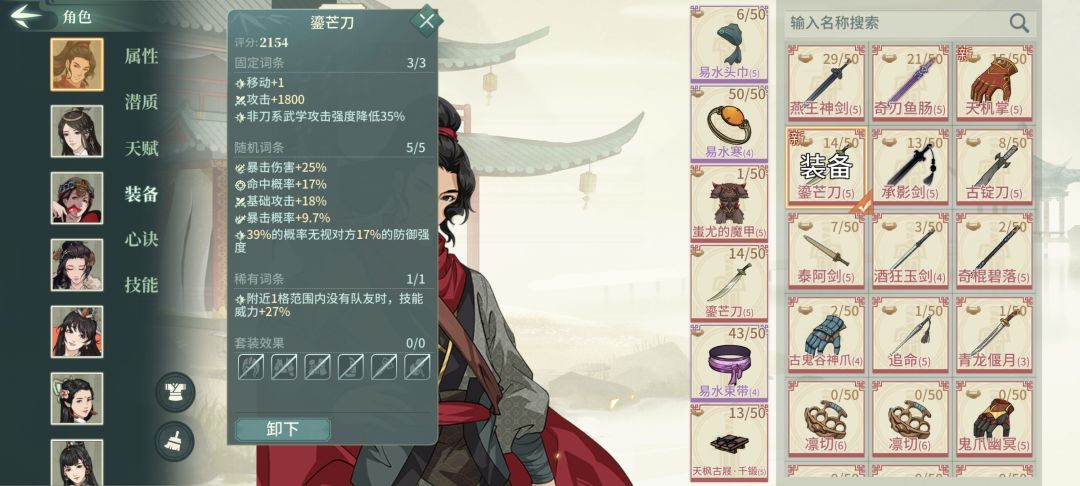 文艺复兴,没平衡之前陆游香君速推我主角也是这套配置。给大藏怒目和素衣是为了第一回合开出反震防止被控制打乱速推节奏(顺便省点极参,嘿嘿)。 这套配置的主角可以用龙象刀,一是伤害更高二是吸盾增加非常多的容错率。我龙象刀之前融了,不然就带上了。 最核心侠客,10公孙绛,00的话把苍冥卸下来。集伤害、免控、控制、压阵、闪避、扰乱为一体的无敌潜质,真的很全面。 无名戒纳兰。第一回合开出洗髓,等对面全部压过来