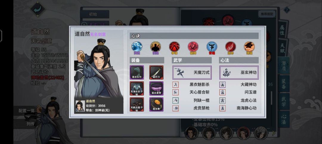 连续签到60天,氪了一块钱拿了无名戒指,终于上极吃了低保,想混个论坛奖励,现在这个分数是为了掉分下去双排捞我小号渡劫,下边发作业。 一、门派:刀魔传人,瘸子师傅的亲传大弟子 二、核心打法和阵容: 这边配了两套阵容,速推和三保一,搭配的侠客有03糖丸,00曲玉,01纳兰,00师姐,00薛涛,23太极拳王维,还有一些其他替补 三、配置图文 平平无奇的刀魔主,关键心决洪流越女,配了个破式,现在感觉越来越