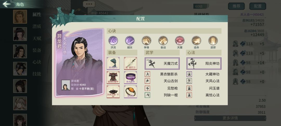 更新前一晚上的极,更新后根据新版本的环境做了些调整,欢迎刀魔兄弟们提出修改意见。 建议使用本套配置的每天8局4胜拿完奖励,不要甲亢,稳定50%胜率,吃低保就完事了。 bp方面第一手随意,玉剑侠、辛剑侠、刘剑仙、张炮王什么的都可以,最后一手ban张良,很关键。 先贴一个刀魔主配置,延用了莫云歌大佬的经典配置,侠隐换成了越女。个人认为阳炎目前还是最优解,要不然藏渊没法处理