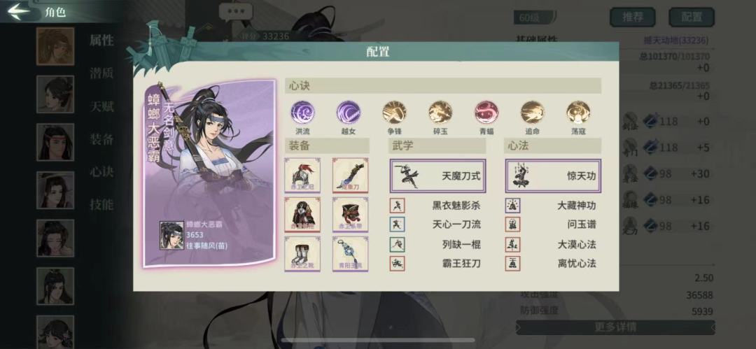 感觉刀魔打着更舒服 先刀魔的,下面是主角和要用的人 龙象刀是打铁送的,用门派武器也可以,命中,暴击率,基础攻击,穿透,词条足够爆伤也洗一下,龙虎心法减反弹,需要1000挑战荣誉,用蚩尤甲会在斩衣boss那里吃亏以及丢连击,打徐夫人容错会下降,如果有足够的玉,可以克攻换追命,天心一刀流换天风剑,看自己资源来,优先升级洪流星噬迅闪,然后克攻破风沧溟,可以遗忘其他心决来返还至玄和太玄玉,1比1返还不会丢