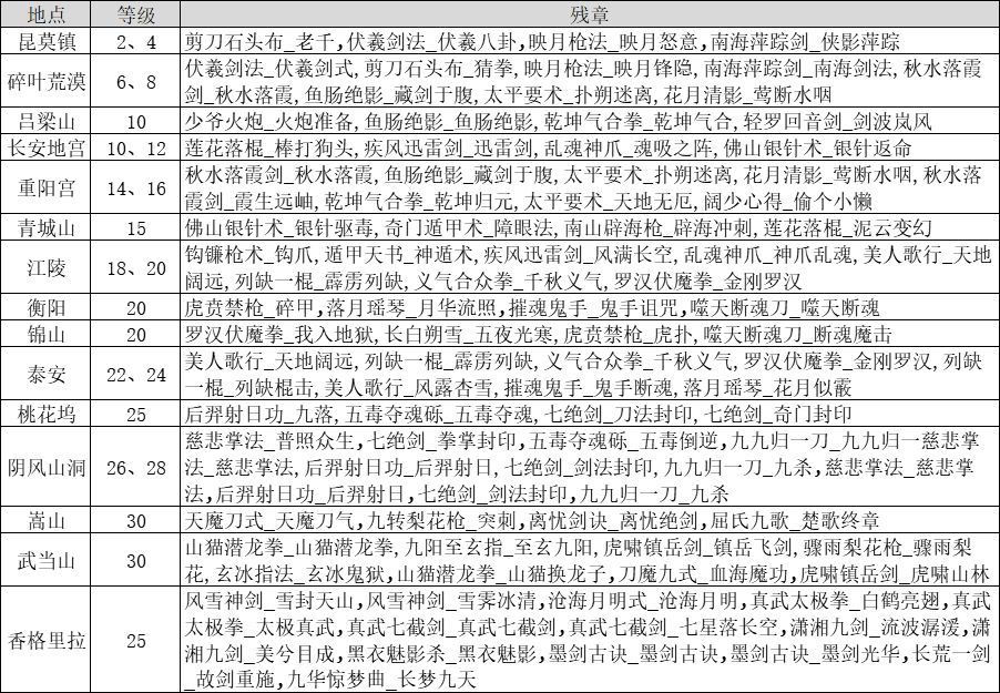 武学上我大体分为三类,侠客专属武学,普通武学,高级武学,侠客专属武学:就是侠客自带武学,有强有弱,普通武学:只是为了和高级武学区分,这类武学可以通过打地图野怪掉落残章,也可以在昆莫镇自行购买武学残章,高级武学:只能通过打香格里拉、30级野怪和天关购买残章,其中侠客武学和普通武学是可以在昆莫镇中购买的,剩下的就是高级武学,下面提供一下残章掉落: 需要注意的是,这里面剑封印只能打,残章商店里面不卖,香