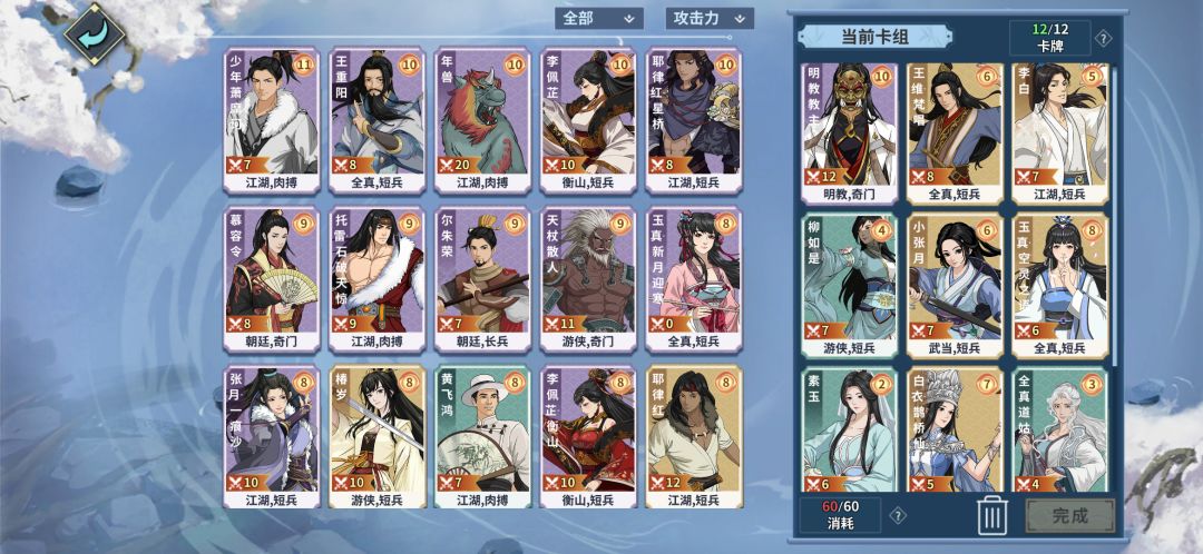主角:张少爷,配合全真高回能量点,使用技能优先把枕徽和小张月抽出来。(枕徽一定要在小张月的前面放置) ⭐核心位:枕徽,小张月。 凭借枕徽在前,小张月在后,打出联动减攻。 小张月可以复制结算上一张牌的结算功能,因此小张月在结算前可以配合枕徽减去敌方共9点攻击。 ⭐资源卡: ①全真道姑,第一回合出现此卡,此时牌里没有枕徽或小张月,就优先放置此卡,可回复6点能量。 ②王维梵唱,二号位输出,打出可回2点能