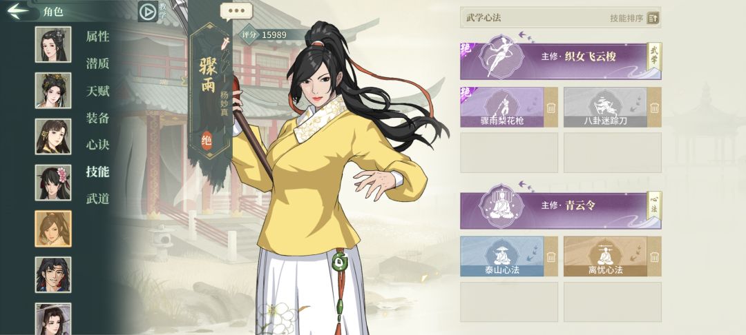 这赛季初玩天工磨练,一直被毒打,有缘一天得到一本降龙十八掌,终于再次化身河洛坏女人。 发作业之前, 特别鸣谢:真龙天子、快没有时间了、醉谪仙、喵言巧语、青霖、孤月游(排名不分先后),你们对我这套作业还有登顶有莫大的启发与帮助!谢谢你们! 【主角配置】 得益于门派套的整体效果,能够给最低集气的队友打打气,化身成为活力小护士。 腰带饰品双定力。 【主力前排配置】 整体思路是以抽蓝为核心,荡寇+控制。 洗