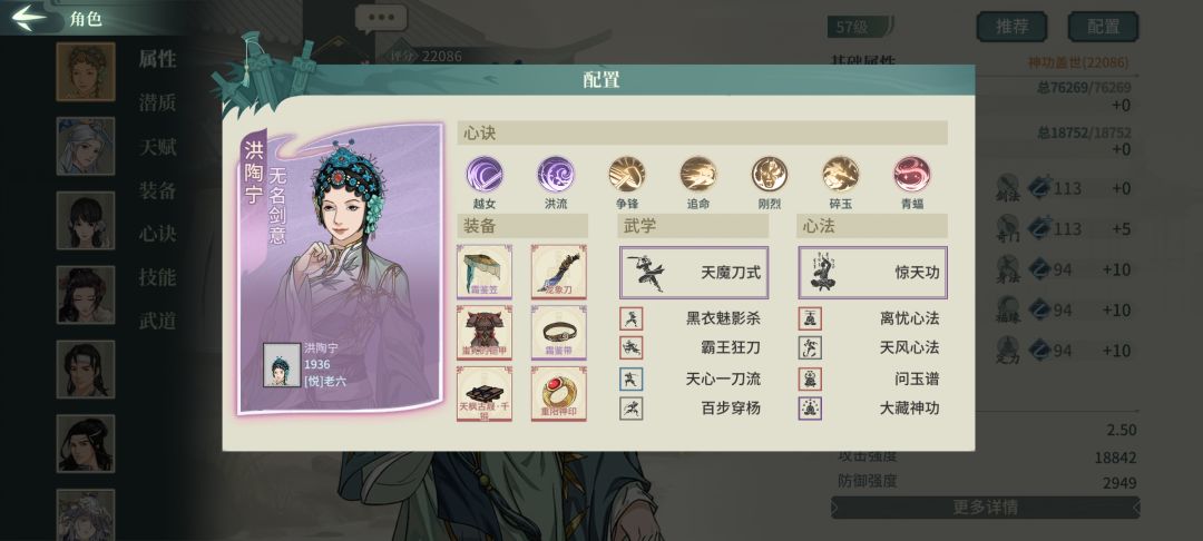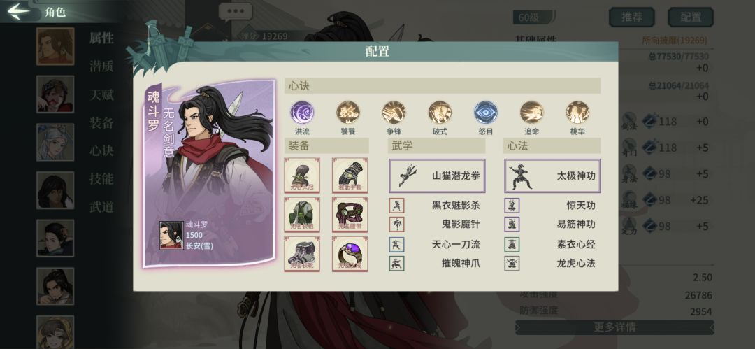 成功用南山拳车翻药傀[表情_酷] 药傀本身是可以跳过二阶段速通,推荐用拳法真伤过(最好是南山拳),我也是差点没过,后面靠满血药回了一波,话不多说,展示武备。 1、武功心法 武功主修满潜南山拳,虎贲加三连击,黑衣加集气,天风加连击概率,后羿加命中概率。 内功主修惊天,当歌可以优化掉,水帝南山必带,东海加连击和身法,太极的气劲和以柔克刚是相当重要的。 2、心决 洪流18级(必带)、承影14级(必带)、