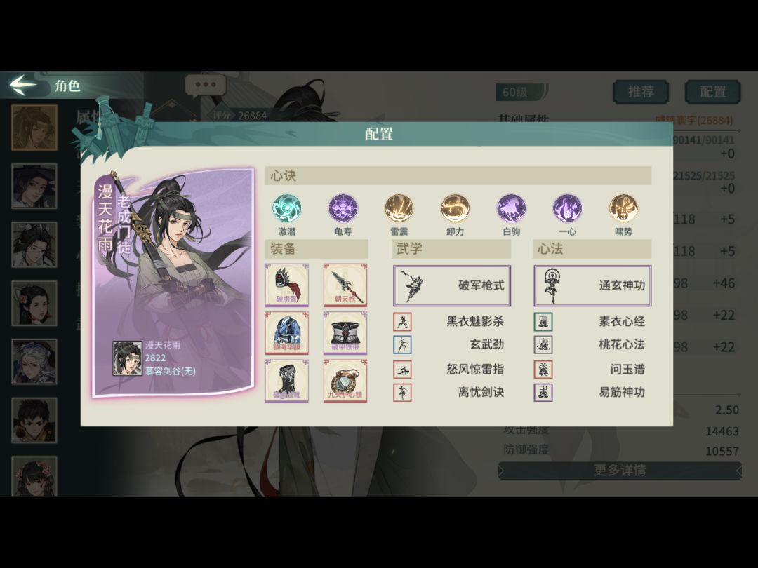破军上赛季配置,上赛季末分数应该是4200上下,具体多少昨天睡太早没打也忘记看了。我根据自己卡池配的,这套最大的优点就是3ban局谁都能打一打,缺点就是上限不算高。 破军主。双根骨,4023休息1。老成武道,斗志昂扬,水月无痕。恒山少的情况可以开普攻,第二个选减cd。 满配素玉,双定力,432内1。 满配张月,双定力,3420休息1。 满配柳如是,舍弃破阵头换破阵心决提高命中,酒狂属性太差而且连动