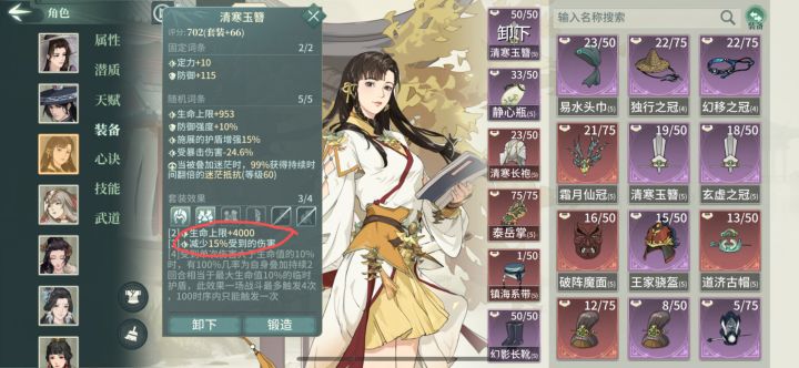 1.不灭遁甲武道选择剑气凝罡(护盾增强)和叠劫锋渊(放大特伤)以泰岳掌作为武器,稀有词条选择眩晕1级1回合,主打多次控制(弱化版大锤)。同时泰岳、双羽、争锋、化劲凑60减伤,可以省本大藏。由此锁定心诀。中规中矩,没啥好说的。内功上,洗髓、临海、大漠、八门基本上是标配了(emmm,在我这是标配),剩下的内功位选择素衣。素衣提供百穴(百穴、峥嵘、怒目?真有八门带这个吗、队友,总得来个回怒,不然洗