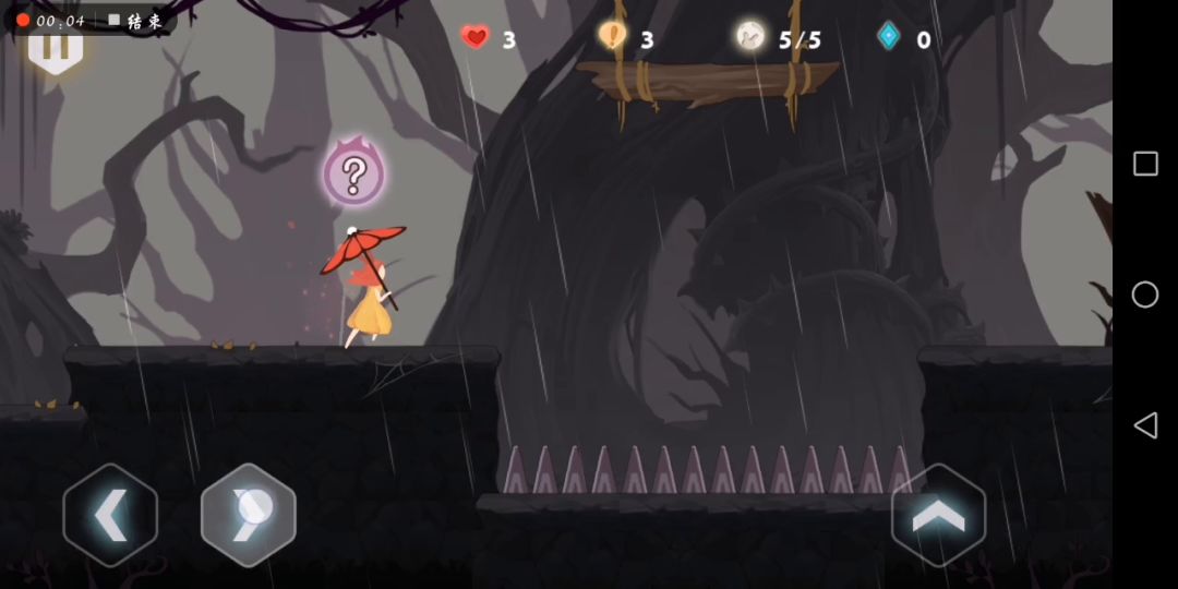 刚刚进游戏……嗯……(跳过了前面的剧情的话)应该有新手教程……但是还是写一下一直往前跑,然后会有个石头,石头点一下就倒下来了。我们继续一路向前,Σ( ° △ °|||)︴哎呦,有棵树!再点一点↑倒下来了。这个桥也是点一点就下来了的这个呢……像转盘一样的那个,可以转(←后面也有类似这样的)转成这样,biu的一下跳上去就好啦!这个斜坡要注意啦,有一个石头会滚下来,然后也要注意那个图案(后面的关卡也有很多这种小图案)↑刚刚要注意的小图案,后面有这种像灯一样的,点一点,然后森之境的第一关就过去啦