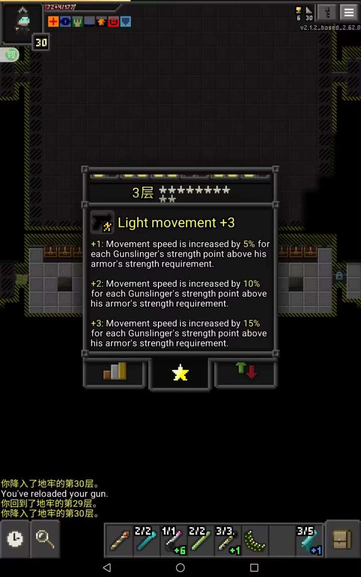 六个boss,感觉黏咕最难,减了前摇根本逃不出爆炸范围,其他几个还好,治疗药水都没有开。打机器人很折磨,表面上是400血,其实一直在加盾,只能硬刮。一路上死了三次,在三区饿死一次,在五区被大眼搞死一次,在六区被士兵射死一次,最后剩两个十字架。士兵有点强,打+10鳞甲能打二十几,防御也挺高。枪手的天赋和特性非常强力,我的力量超出护甲需求10点,能加150%移速,结果一回合可以移动4次,首次攻击一个敌