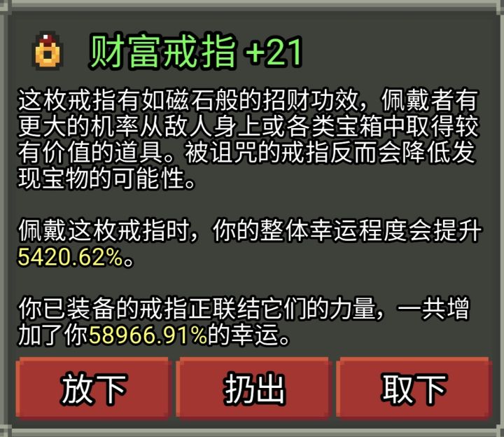 种子(这一串数字):4345753547814二楼财富戒+2,五楼有驱邪,七楼有玫瑰。19楼小恶魔给+4的能量戒,用嬗变变成财富就可以了。拿走吱一声,人多的话继续发逆天种子。