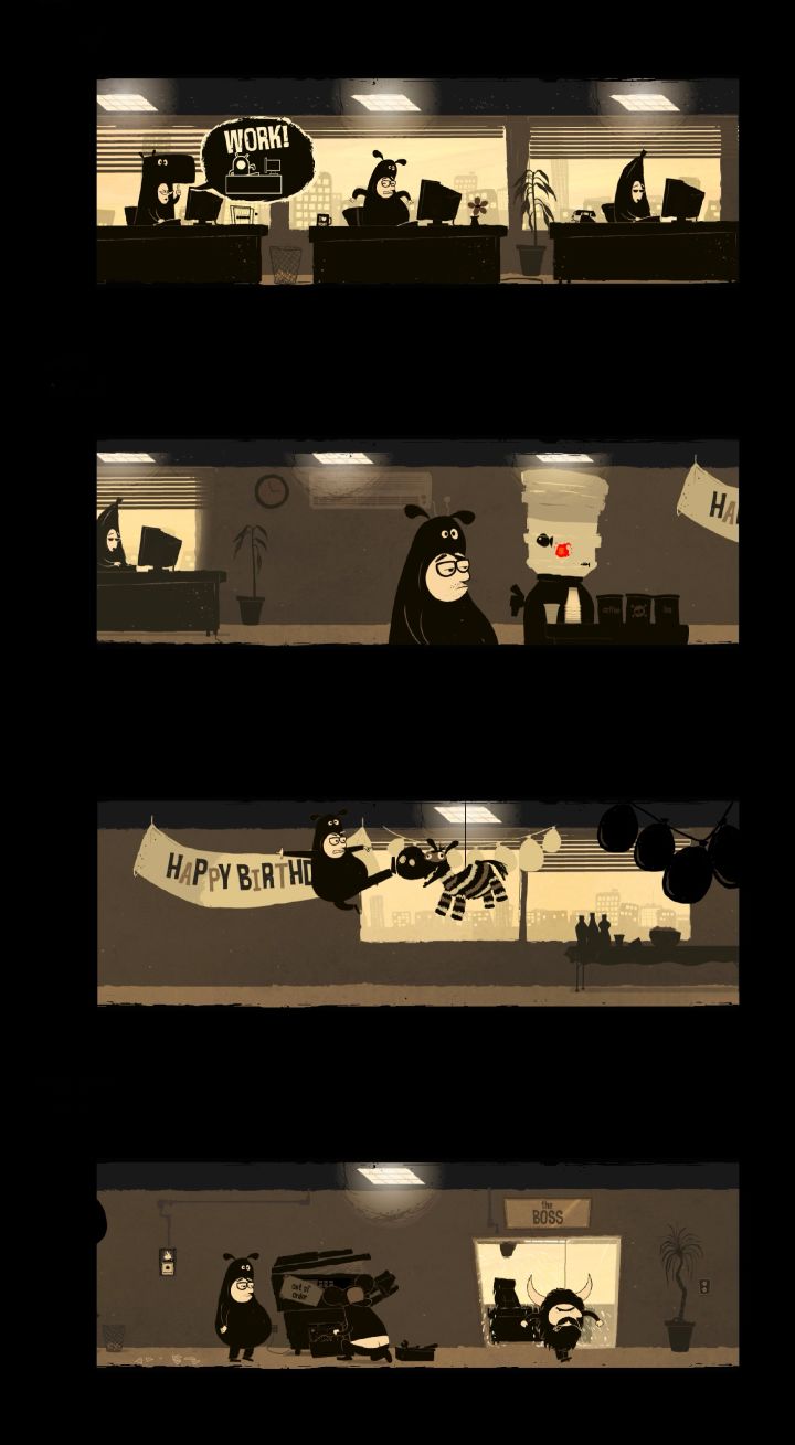 游戏非常有趣,设计得很特别,很久没有玩到过这种极具探索性、给人惊喜的游戏了。主角是一个平凡的牛马,要避开老板的监视,跟着橙红色小花,离开办公室,到森林,到沙漠,到高空,最后乘着热气球来到满是橙红色小花的花园,摘下这些美丽的花朵,回到办公室,送给老板和同事,送给路上遇到的朋友们。游戏有难度,适合常玩解谜游戏的玩家。游戏没有对白、没有字幕、没有提示,需要玩家自主探索完成任务。解谜设计丰富多样,基本包