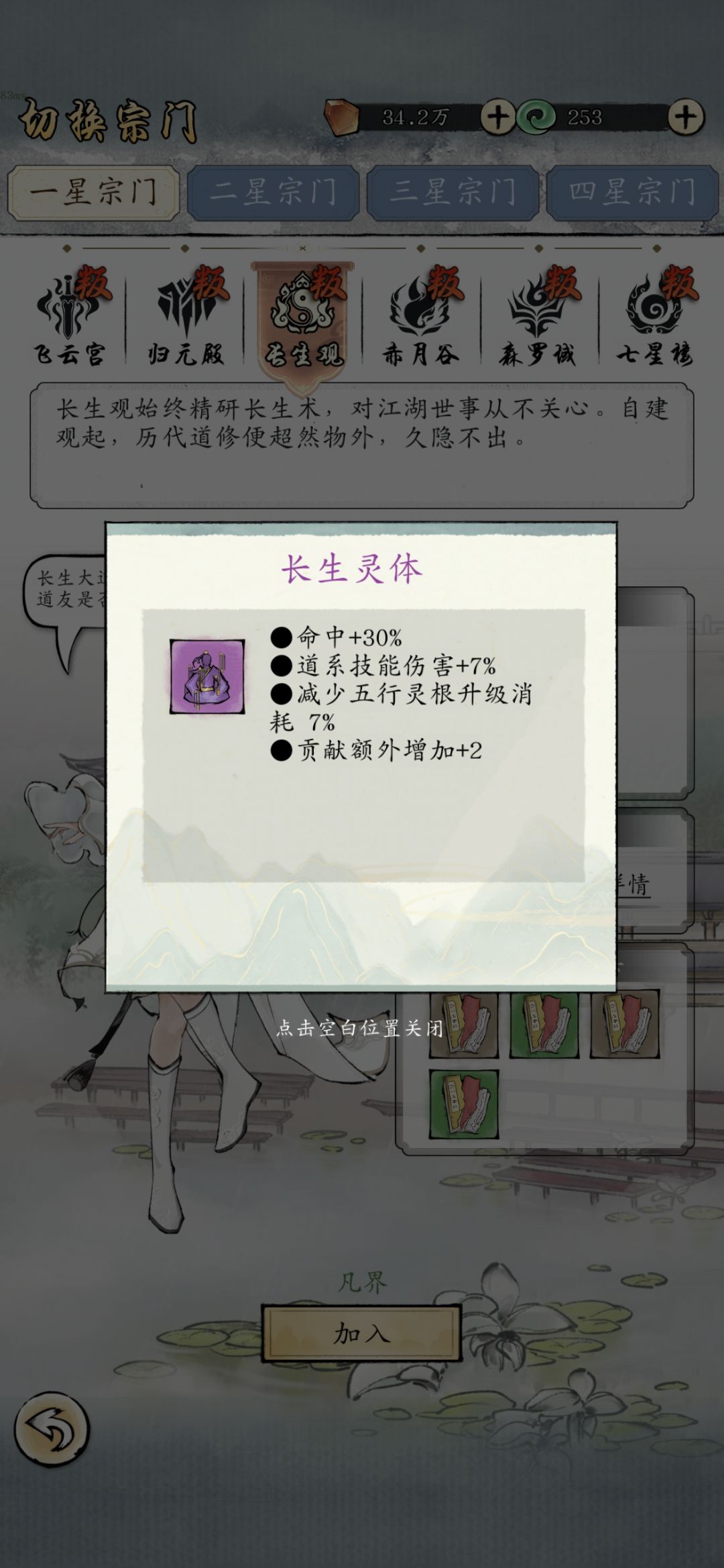 多说无益,直接上干货 1.关于宗门,重要[酷],开局宗门不要选归元殿和长生观 宗门等级达到真传弟子在禁地会有幻境时空 归元殿-归心儒体(0氪前期可以一直用3个月) 长生观-长生灵体(增加宗门日常任务贡献基数) 建议第一个选另外三个,1000贡献买了玉简拿了伴侣直接判门 第二个选归元殿,拿到直接拉满,可以带到快毕业 第三个选长生观,拿了长生灵体,判门速度会增加 所以第一天不要选择这两个宗门,在做主线