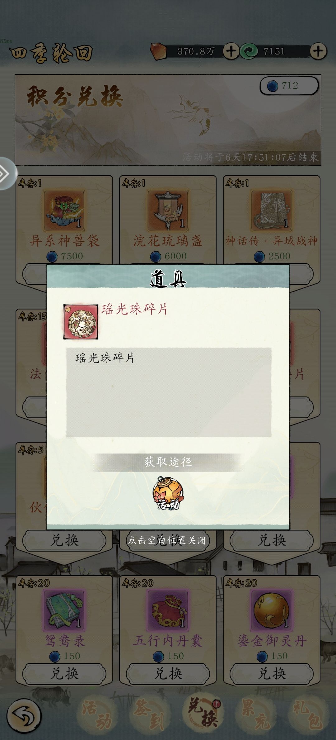 游历实在凡界的无门槛活动,我们可获取最重要的玉,人物宠物属性丹药,道侣好感材料,种子,天地灵液等一些好东西。还有紫色,金色商店刷新,游历偶遇道侣等,多个不同事件。 我们会需要很多材料昂贵,奖励廉价的,低需求物品,浪费我们获得高品质奖励的机会,这时候需要卡事件,至于卡哪些事件呢,比如 这四个都是狗屎一样的奖励,在开局还好,很方便制造,越往后越麻烦,这个时候就卡住,不去做,后面就只会刷其他的,这个时候