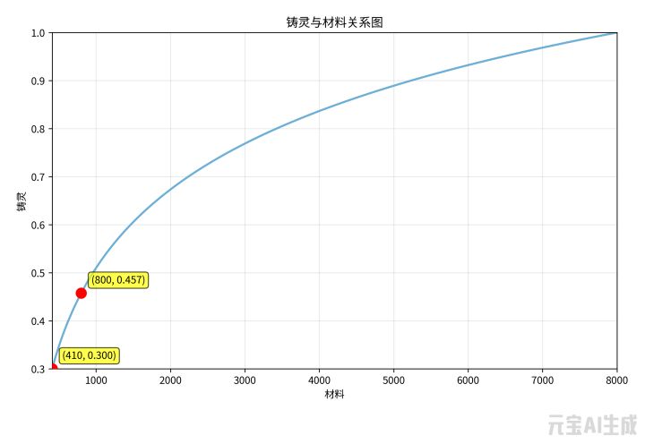 测试为元婴装备,凡界火。由于上800不可变,是常数,只需考虑下条材料和铸灵产出的关系,如图一对数函数。下条投入二十倍,铸灵只提高三倍,考虑到一般人没那么富裕,只推荐410和800左右两个点位。某大乘中阶好友全部身价投入下800点,能炼945个铸灵左右。如果材料全由扫荡秘境获得,那折合1灵10-20玉,总之血贵,应该也不赚,所以不建议道友们尝试。——此帖个人测算,不保对,有焚决的大佬还请多多指点