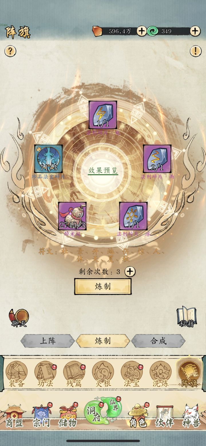 炼虚(起步阶段),应用图1(成本略高),图2(过渡使用,只要是天元丹就行,不管几品)当前阶段资源有限,不建议大肆炼旗,如果要炼,着重以下词条:【斩杀】:推荐指数5颗星(小登的话紫斩杀也可以用)应用场景:1.乌奴山飞升之后,可以跨服联动,有这个词条可以尝试抢尾刀;2.应对大荒蛮体的致死免伤,神兽穷奇的免死神通【连续攻击】:推荐指数4颗星应用场景:让伙伴更快叠出buff,如果词条不多